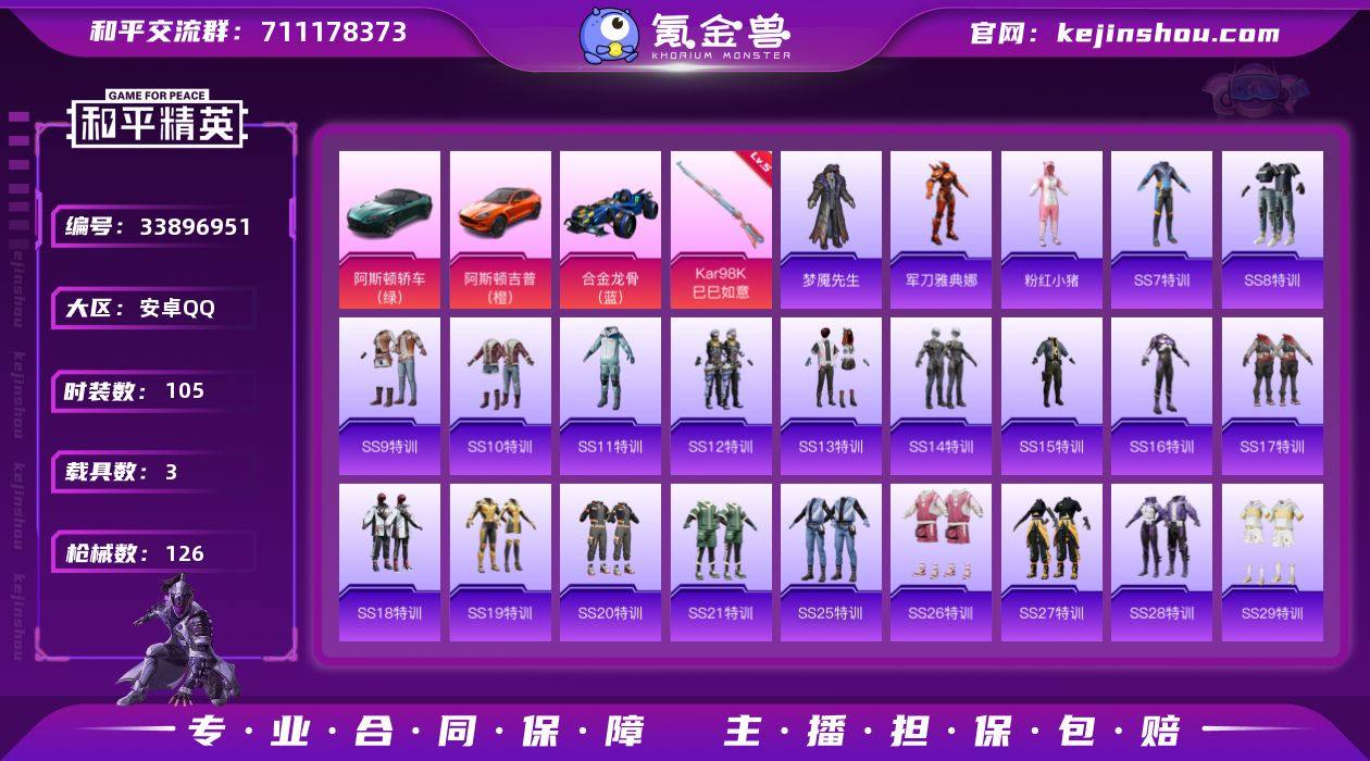 安卓手Q-1特效枪-3载具-42686热力值-3王牌印记-105套装-126枪皮 【热门品类】:角色-军刀雅典娜,套装-粉红小猪 【粉色枪皮等级】:Kar98K-巳巳如意(五级) 【粉色载具】:阿斯顿马丁DBS(绿),阿斯顿马丁DBX(橙),合金龙骨(蓝) 【粉色枪皮】:Kar98K-巳巳如意 【粉色降落伞】:天启纪元降落伞,神秘黑猫降落伞,伏魔团降落伞,心之恋语降落伞,恐龙拽拽降落伞,筑梦精灵降落伞 【稀有枪皮】:AKM-夜灯,AKM-恐龙拽拽,AKM-灼热熔岩,AKM-萌趣颜团子,AKM-霓虹街区,AKM-龙的传人,M16A4-幻世战舞者,SCAR-L-怪兽之王,SCAR-L-炫彩节奏,SCAR-L-玉兔迎春,M416-夜灯,M416-糯团青竹,GROZA-治愈之星,GROZA-生命誓言,AUG-耀粉歌者,QBZ-原初圣火,QBZ-彩虹符号,QBZ-神秘黑猫,QBZ-飞驰魅影,M762-天降萌叽,M762-彩虹符号,M762-牛气冲天,M762-瑞龙福将,M762-绯红前夜,M762-镭射皇者,G36C-不夜海上花,AC-VAL-天降萌叽,蜜獾-娇憨猪猪,UZI-众神之王,UZI-娇憨猪猪,UZI-炫彩节奏,UMP45-生命誓言,Vector-彩虹符号,Vector-暗夜玫瑰,Vector-治愈之星,Vector-生命誓言,汤姆逊-勇闯险境,汤姆逊-天降萌叽,MP5K-众神之王,P90-飞驰魅影,Kar98K-勇闯险境,Kar98K-...