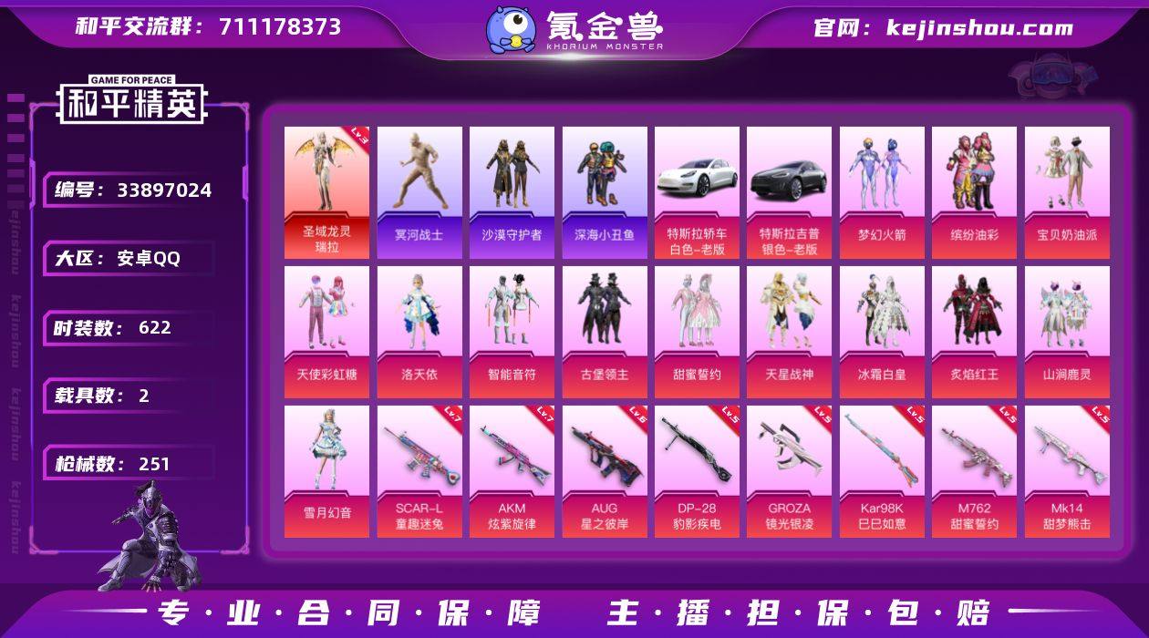 【特价出售】钱包不能注销安卓Q-1红装2稀有2载具13粉装11特效枪29热门173套装251枪皮 87551热力值 14印记 历史超级王牌11星 【1红装】 圣域龙灵-瑞拉 (3级) 【2稀有】 木乃伊 AKM-缤纷海域 【2载具】 特斯拉3白色 特斯拉X银色 【13粉装】 梦幻火箭 宝贝奶油派 天使彩虹糖 洛天依 雪月幻音 天星战神 智能音符 缤纷油彩 古堡领主 甜蜜誓约 冰霜白皇 炙焰红王 山涧鹿灵 【11特效枪】 AKM-炫紫旋律 (7级) Kar98K-巳巳如意 (5级) M762-甜蜜誓约 (5级) DP-28-豹影疾电 (5级) Mk14-甜梦熊击 (5级) GROZA-镜光银凌 (5级) SCAR-L-童趣迷兔 (7级) AUG-星之彼岸 (6级) M416-风花雪月 (4级) Mk14-福马献瑞 (2级) ACE32-萌骑漫游 (5级) 【29热门】 龟仙人 雪山精英 潮萌小黄鸭 鹰眼刺客 软萌银虎 激萌罗小黑 沙漠守护者 迅捷狂鲨 深海小丑鱼 大橘为重 浪漫波比 4AM战队服 神秘黑猫 暗夜契约 暗影哥特 团圆交子 瑞龙福将 纯白誓言 豚鼠丹丹 漫步者 白虎圣者 风华少年志 白月香洋装 军刀雅典娜 英勇保护者 弄潮海豚 M762-瑞龙福将 M249-古堡领主 Kar98K-古堡领主 【4飞行器】 炫紫旋律飞行器 神秘黑猫飞行器 古堡领主飞行器 黄族统领飞行器 【6头盔】 童趣迷兔头盔 梦幻火箭头盔 甜心宝贝头盔...