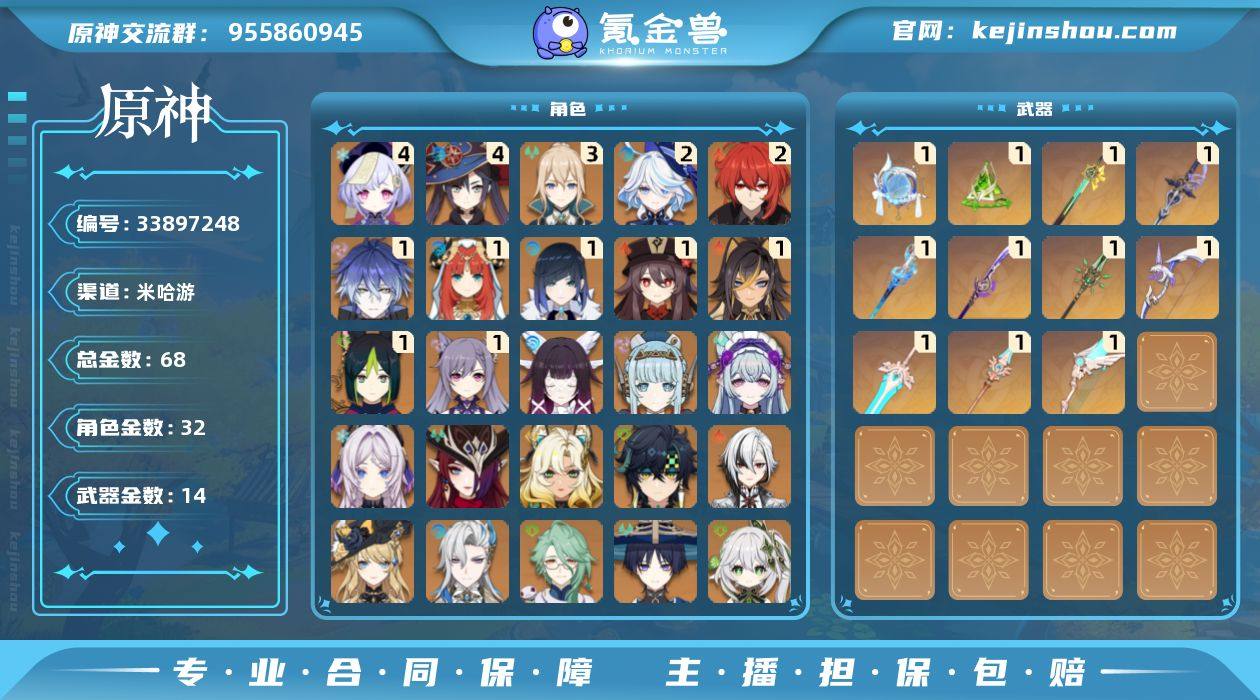 60级/68黄/女主/32个五星角色/14个五星武器/一命菲林斯/伊涅芙/哥伦比娅/娜维娅/钟离/恰斯卡/枫原万叶/茜特菈莉/甘雨/神里绫华/雷电将军/基尼奇/纳西妲/一命提纳里/二命芙宁娜/那维莱特/一命妮露/一命夜兰/阿蕾奇诺/一命胡桃/珊瑚宫心海/希诺宁/梦见月瑞希/魈/流浪者/三命琴/一命刻晴/白术/四命莫娜/一命迪希雅/二命迪卢克/四命七七/阿莫斯之弓/天空之翼/真语秘匣/薙草之稻光/和璞鸢/天空之脊/天空之傲/岩峰巡歌/赦罪/静水流涌之辉/帷间夜曲