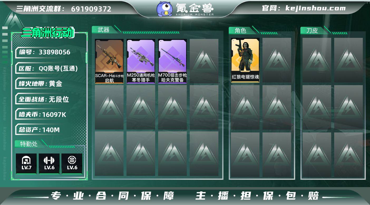 总资产:140.6M, 哈夫币:16097K ;总资产(M):140M/哈夫币(K):16097K/哈夫币(K):16097K/全面战场等级:1_段位:无段位/烽火地带等级:60_段位:黄金 红狼-电锯惊魂,近战-黑鹰,SCAR-H战斗步枪-启航,M250通用机枪-寒冬猎手,M700狙击步枪-哈夫克警备,AKM突击步枪-肃杀,M7战斗步枪-捣蛋鬼,MP5冲锋枪-哈夫克卫队,Vector冲锋枪-先锋,UZI冲锋枪-亚特兰蒂斯,SMG-45-行动开启,Mini-14射手步枪-荣耀列队,轮式突击炮-荣耀,挂饰-诡影狙击兵,挂饰-诡影喷火兵,挂饰-崩岩重炮,挂饰-启程