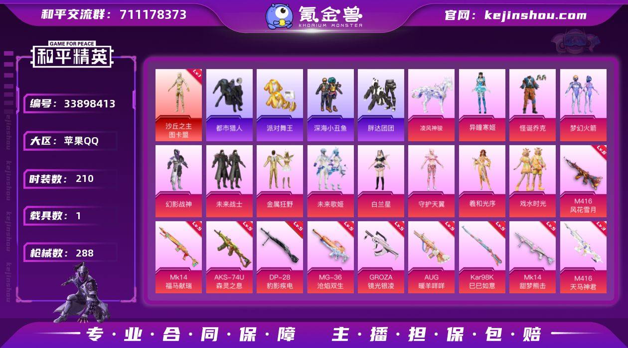 苹果 手Q-1神装-11粉装-12特效枪-1载具-10粉色飞行器-88488热力值-16王牌印记-210套装-288枪皮 【红色神装等级】:沙丘之主-图卡盟(一级) 【红色角色神装】:沙丘之主-图卡盟 【热门品类】:粉装-怪诞乔克,粉装-梦幻火箭,套装-浪漫天命,套装-都市猎人,套装-派对舞王,套装-深海小丑鱼,角色-军刀雅典娜,套装-胖达团团,套装-忍者信条,套装-暗夜之虎,套装-龟仙人,套装-暗影哥特,角色-Mark.06,熔岩游骑兵连帽夹克,套装-红熊茄茄 【粉色套装】:粉装-幻影战神,粉装-未来战士,粉装-怪诞乔克,粉装-梦幻火箭,粉装-金属狂野,粉装-未来歌姬,角色-白兰星,角色-守护天翼,角色-羲和光序,粉装-戏水时光,角色-异瞳寒姬 【粉色枪皮等级】:M416-风花雪月(六级),M416-天马神君(三级),GROZA-镜光银凌(五级),AUG-暖羊咩咩(五级),ACE32-萌骑漫游(二级),AKS-74U-森灵之息(五级),Kar98K-巳巳如意(五级),Mk14-甜梦熊击(五级),Mk14-福马献瑞(五级),DP-28-豹影疾电(五级),PKM-萌骑夺宝(二级),MG-36-沧焰双生(五级) 【粉色载具】:凌风神骏 【粉色枪皮】:M416-风花雪月,M416-天马神君,GROZA-镜光银凌,AUG-暖羊咩咩,ACE32-萌骑漫游,AKS-74U-森灵之息,Kar98K-巳...