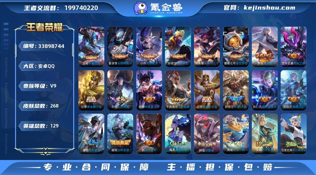 【精品号手慢无】 v9;268皮肤 6典藏 13传说 65星元 1天幕;典藏: 吕布-千魇归渊 | 鲁班七号-星空梦想 | 小乔-天鹅之梦 | 夏侯惇-无限飓风号 | 孙悟空-全息碎影 | 孙尚香-杀手不太冷。
