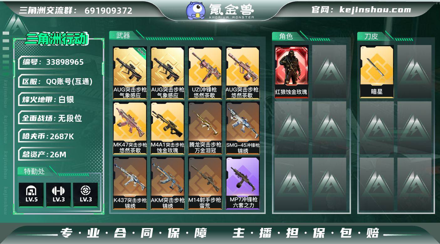 【SJ1577】【无封禁有二次带S8高级3X2】36级/总资26M/流资21M/670点卷/AUG突击步枪(优品B)刀皮(暗星)红狼(蚀金玫瑰)/5级仓库3级体力3级负重1级潜水 【干员外观】:红狼-蚀金玫瑰 【近战皮肤】:近战-暗星,近战-黑鹰 【典藏外观】:AUG突击步枪-气象感应 【典藏外观成色】:AUG突击步枪-气象感应(优品B) 【传说外观】:M4A1突击步枪-蚀金玫瑰,AKM突击步枪-锦绣,AUG突击步枪-悠然茶歇,腾龙突击步枪-万金泪冠,K437突击步枪-锦绣,MK47突击步枪-悠然茶歇,UZI冲锋枪-悠然茶歇,SMG-45冲锋枪-锦绣,M14射手步枪-蛮荒 【史诗外观】:勇士冲锋枪-檀劫铳影*2,K416突击步枪-冬日风情,K416突击步枪-腊梅,AUG突击步枪-蝮蛇,SR-3M紧凑突击步枪-开工大吉,勇士冲锋枪-丛影谍踪,MP7冲锋枪-六套之力,M249轻机枪-丛影谍踪,VSS射手步枪-丛影谍踪 【稀有外观】:AUG突击步枪-旧梦*2,M14射手步枪-巨兽,M4A1突击步枪-千里骏骨,AS Val突击步枪-休闲时光*2,SCAR-H战斗步枪-休闲时光*2,AKS-74U突击步枪-休闲时光,SG552突击步枪-2026,SG552突击步枪-马年新春, AK-12突击步枪-马年新春,CAR-15突击步枪-来财,KC17突击步枪-来财,MP5冲锋枪-弄臣,SMG-45冲锋枪-行动开启,SR-3M紧凑...