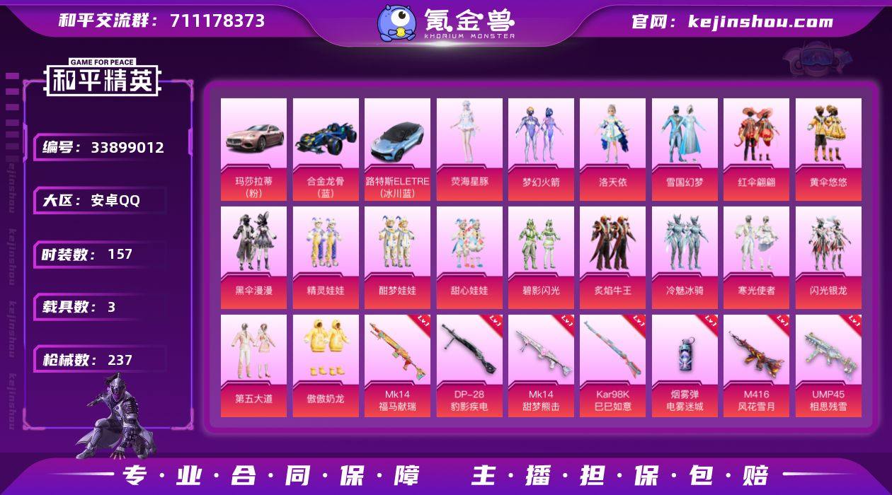 【战神框冰雪女王17粉装14特效枪3载具 秒换绑不用等】 安卓Q区-82233热力值-12印记-历史最高段位:无敌战神-157套装-237枪皮 【3载具】 玛莎拉蒂粉色 路特斯EL蓝色 合金龙骨蓝色【4稀有】 奇异狩猎者 M416-黄金龙骨 AWM-黄金龙骨 SCAR-L-粉色回忆【17粉装】 梦幻火箭 雪国幻梦(冰雪女王) 洛天依 甜心娃娃 寒光使者 酣梦娃娃 精灵娃娃 傲傲奶龙 炙焰牛王 冷魅冰骑 红伞翩翩 黄伞悠悠 黑伞漫漫 碧影闪光 第五大道 闪光银龙 角色-荧海星豚【14特效枪】 M416-风花雪月(7级) Mk14-福马献瑞(1级) GROZA-焦糖拿铁(4级) SCAR-L-青春物语(4级) AUG-超新星(7级) AKM-百合蜜语(5级) M762-甜心娃娃(4级) P90-能量风暴(5级) UMP45-相思残雪(5级) MG3-洛神天依(7级) 烟雾弹-电雾迷城(4级) Kar98K-巳巳如意(5级) Mk14-甜梦熊击(5级) DP-28-豹影疾电(5级)【173热门】 鹰眼刺客 破蛋小黄鸡 小丑鱼 迅捷狂鲨 金羽特工 军刀雅典娜 英勇保护者 暗影哥特(红眼罩) 醒狮腾龙 团圆交子 瑞龙福将 豚鼠丹丹 SS27特训 SS26特训 SS25特训 SS24特训 SS22特训 Mk47-洛神天依 Mk14-暗星紫秘 Mini14-梦幻火箭 M762-暖熊萌萌 Kar98K-红伞翩翩 AKM-环太平洋 SCAR-L-玉兔迎春 GROZA-田园牧歌 GROZA-恐龙拽拽 AUG-...