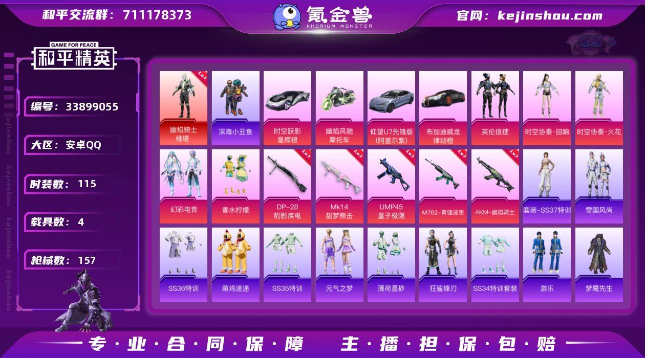 【1红装4载具5粉装5特效枪 秒换绑不用等】 安卓Q区-53130热力值-3印记-115套装-157枪皮 【1红装】 幽焰骑士-维塔(2级)【4载具】 仰望U7先锋版(阿盖尔紫) 时空跃影(星辉银) 幽焰风驰摩托车 布加迪威龙(律动橙)【1稀有】 奇异狩猎者【5粉装】 香水柠檬 时空协奏·回响 时空协奏·火花 幻彩电音 英伦信使【5特效枪】 AKM-幽焰骑士(3级) M762-青锋波束(5级) Mk14-甜梦熊击(5级) DP-28-豹影疾电(5级) UMP45-量子极限(5级)【160热门】 梦魇先生 破蛋小黄鸡 深海小丑鱼 狂沙舞者 白色伏地魔 SS26特训 AKM-缤纷海域 M762-天降萌叽 M416-夜灯 M249-彩虹符号 MG3-幻世战舞者 AKM-虎虎生威 M416-蓝色火焰 GROZA-异彩先驱 GROZA-蓝莓炮弹 长空猛禽 异彩先驱 虚音幻奏 夏日倾情 甜心亚梦 特训学院 青年教官 霓虹街区 霓虹极客 魅力单车 六六大吉 猎鹰 黎明保卫者 蓝色运动 橘黑制服 黄色运动 黄色伏地魔 S686-奇异狩猎者 红色运动 黑色伏地魔 海岛探路者 登山爱好者 M762-奇异狩猎者 S1897-糯团青竹 GROZA-紫矿核心 顶瓜瓜 M249-无面战甲 雏菊兔兔 SS34特训 蜜獾-鸡智如我 AWM-天降萌叽 SS18特训 SS17特训 SS19特训 SS20特训 蓝冰羽 SS29特训 萝兰蝴蝶 破片手榴弹-爆破雪人 SS30特训 青团波波...