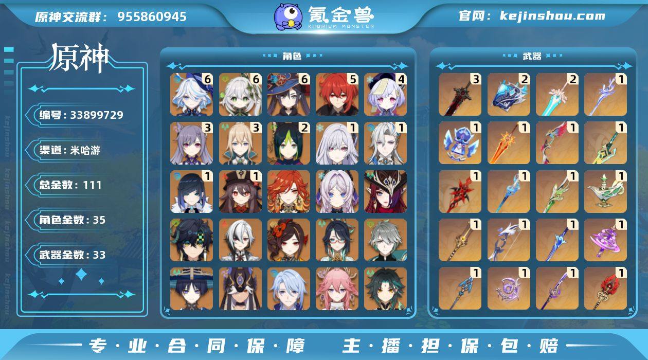 邮箱: 不送邮/死邮 总黄数: 111 冒险等级: 60 6命金色角色: 满命莫娜,满命纳西妲,满命芙宁娜 5命金色角色: 五命迪卢克 4命金色角色: 四命七七 3命金色角色: 三命刻晴,三命琴 2命金色角色: 二命提纳里 1命金色角色: 一命胡桃,一命夜兰,一命那维莱特,一命丝柯克 0命金色角色: 温迪,枫原万叶,优菈,宵宫,可莉,达达利亚,钟离,甘雨,魈,雷电将军,申鹤,八重神子,神里绫人,赛诺,流浪者,艾尔海森,闲云,千织,阿蕾奇诺,基尼奇,恰斯卡,玛薇卡,茜特菈莉 拥有武器: 狼的末路,天空之翼,四风原典,天空之卷,和璞鸢,天空之傲,风鹰剑,天空之刃,磐岩结绿,护摩之杖,薙草之稻光,不灭月华,息灾,神乐之真意,波乱月白经津,若水,赤沙之杖,千夜浮梦,裁叶萃光,苇海信标,万世流涌大典,静水流涌之辉,赤月之形,山王长牙,星鹫赤羽,焚曜千阳,祭星者之望,苍耀 3精武器: 狼的末路 2精武器: 天空之傲,万世流涌大典 1精武器: 天空之翼,四风原典,天空之卷,和璞鸢,风鹰剑,天空之刃,磐岩结绿,护摩之杖,薙草之稻光,不灭月华,息灾,神乐之真意,波乱月白经津,若水,赤沙之杖,千夜浮梦,裁叶萃光,苇海信标,静水流涌之辉,赤月之形,山王长牙,星鹫赤羽,焚曜千阳,祭星者之望,苍耀