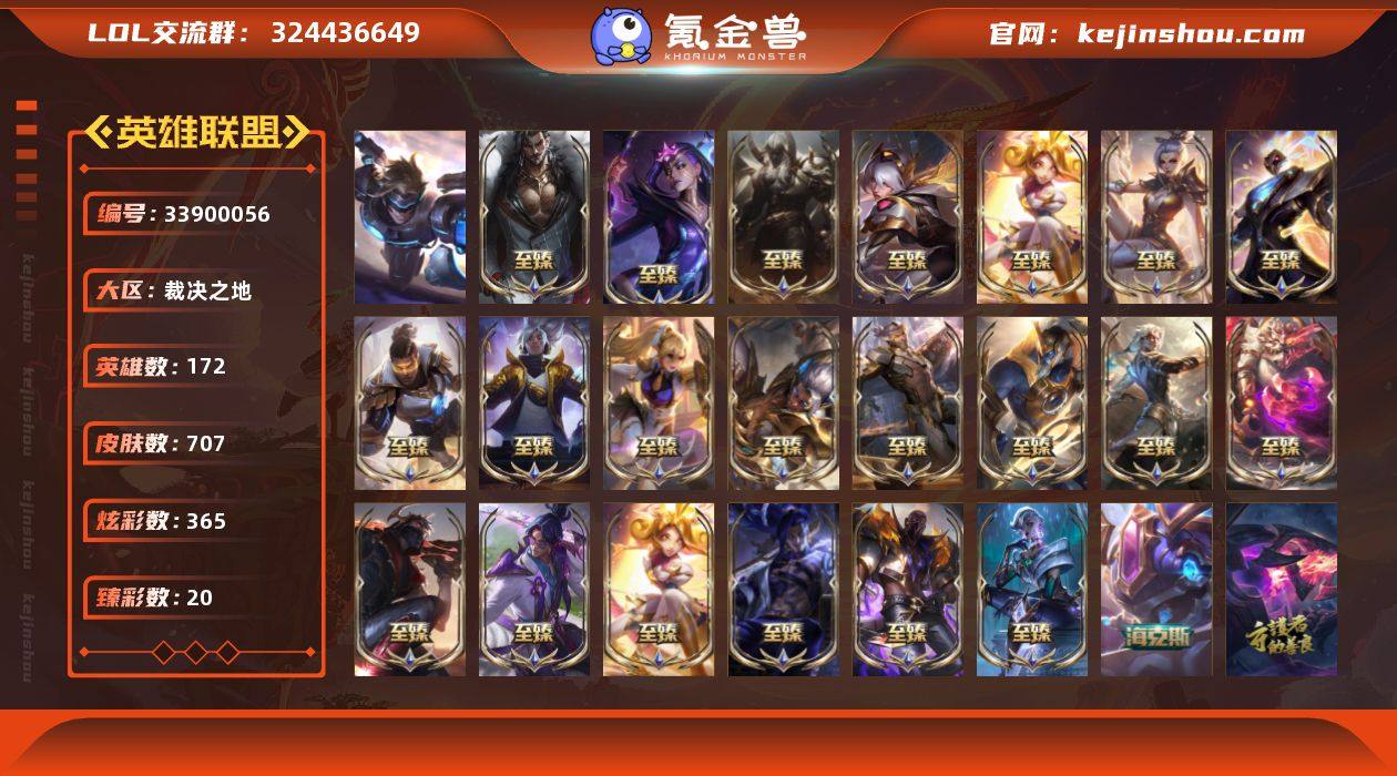 t40566【裁决之地】707皮肤 365炫彩 20臻彩 29神话/82限定/82传说/172英雄 账号等级:837 【重要头像】爱意绵绵 爱情之歌 心型钥匙 我麦是开的么 星守金克丝炫彩 征服者韦鲁斯炫金 西部魔影卢锡安炫彩头 【重要皮肤】狼神英灵斯维因至臻 暗星女王黛安娜至臻 北极星钢影卡蜜尔至臻 斗魂觉醒派克至臻 墨之影武者亚索至臻 灵魂莲华易至臻 西部魔影猎天使恶魔泰隆至臻 战斗学院蕾欧娜至臻 未来战士卢锡安至臻 真实伤害亚索至臻 源计划逆流塞拉斯至臻 神龙尊者炎龙瑟提至臻 黑夜使者凯隐至臻 神龙尊者均衡之龙沃利贝尔至臻 飞升战神潘森至臻 星之守护者妮蔻至臻 源计划正义艾瑞莉娅至臻 玉剑传说武剑仙至臻 腥红之月亚托克斯至臻 未来战士锤石至臻 殿堂传奇乐芙兰 灰烬骑士派克 灰烬征服者潘森 海克斯科技克格莫 暗星科加斯 胜利剑圣易 胜利女神希维尔 胜利之王泰达米尔 胜利巨口克格莫 钢铁军团拉克丝 女帝厄运小姐 猛虎下山赵信 神龙之翼库奇 征服者贾克斯 福牛守护者厄斐琉斯 福牛守护者德莱厄斯 胜利女神瑟庄妮 胜利之树茂凯 胜利机器人布里茨 胜利女神奥莉安娜 胜利枪神格雷福斯 胜利枪神卢锡安 胜利女神莫甘娜 胜利之剑亚...