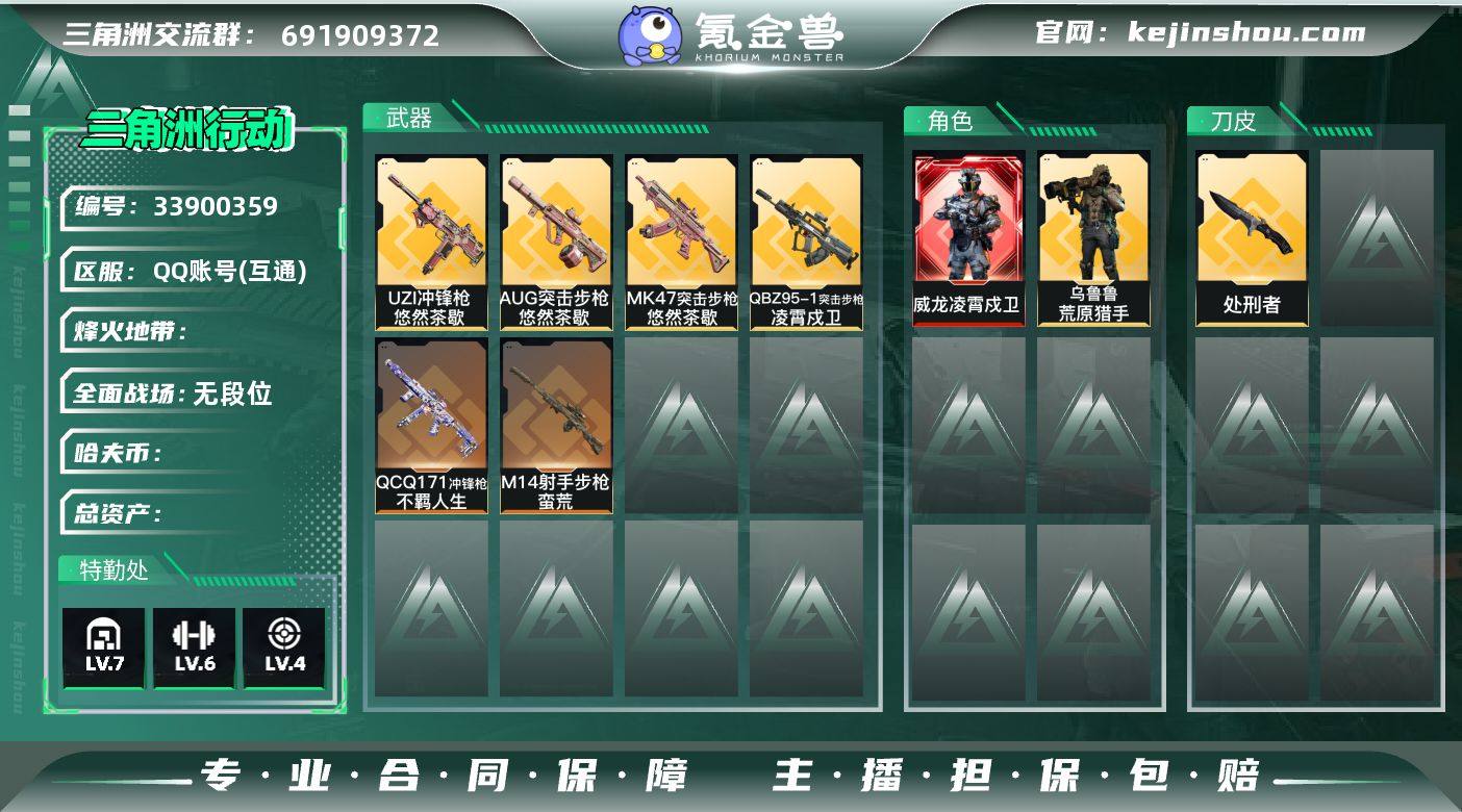 【总资产100M 哈弗币8.1万 干员外观2个 烽火60级 黄金】威龙-凌霄戍卫,乌鲁鲁-荒原猎手,总资产100M,哈夫币81409,黑鹰,处刑者,QBZ95-1突击步枪-凌霄戍卫,AUG突击步枪-悠然茶歇,MK47突击步枪-悠然茶歇,UZI冲锋枪-悠然茶歇,QCQ171冲锋枪-不羁人生,M14射手步枪-蛮荒df5-03,编号:SXMQQ37