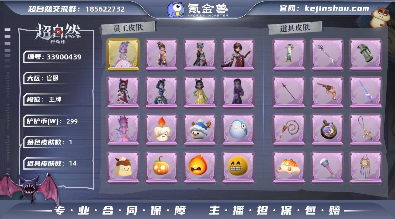 金皮1;紫皮8;道具皮14;皮肤:小黄-遗失的童话,小黄-呱呱雨衣,爱丽丝-丝缕哀歌,艾伦-黎明猎手,莉莉-情公主,阿念-庆宴绮愿,莉莉-莓果陷阱,小黄-异色序曲,薇薇安-仙锋小姐;道具:传送按钮-浮生一梦,摸金符-祝祷词,闪光弹-金戈玄铜,喷气背包-乘风溯雪,铲子-撒拉弗的祷告,传送按钮-逆时审判,音响-鸣沙鼓,长鞭-缚誓之锁,长枪-罪棘,腰包-红运福虎,专业手电-云端梦想计划,急救包-蔷薇物语,桃木剑-最后的独角兽,转轮手枪-新星时代;饰品:头饰-呆滞头套,头饰-大葱明头套,头饰-雪墩墩头套,头饰-火爆了头套,头饰-惊魂南瓜头套,头饰-烛光纪念,头饰-太空鲨头套,头饰-鱼头怪头套,头饰-哈士奇头套,头饰-炙热烧烤,头饰-咬咬鲨头套,头饰-嘻嘻头套,头饰-樱桃奶油布丁,头饰-滑稽头套,头饰-面具马头套,头饰-蒜了八,头饰-烈焰红唇头套,头饰-卑微头套,头饰-小狗蛇点点头套,头饰-萨卡班甲鱼头套,头饰-像素朋克墨镜,头饰-后室幸存者头套,挂饰-不朽的今夜,挂饰-晚安小熊,挂饰-孤独对望,挂饰-未竟乐园,挂饰-天使消失的年代,背饰-牛啤背包,背饰-小小情公主,背饰-云梦之星,背饰-小小水王子;主页装扮:主页装扮-樱落金笺;动作:动作-企鹅舞,动作-知世摇,动作-小雨摇,动作-luvaboy,动作-新年摇,动作-舞...