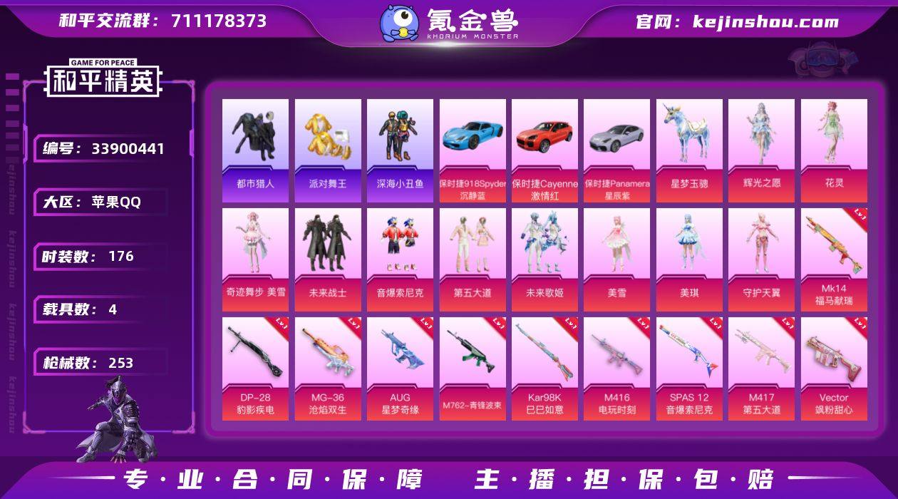 可二次实名【AUG星梦奇缘都市猎人金鞋螳螂4载具10粉装10特效枪 秒换绑不用等】 苹果Q区-76160热力值-176套装-253枪皮 【4载具】 星梦玉骢 保时捷Cayenne(激情红) 保时捷918 Spyder(沉静蓝) 保时捷Panamera(星辰紫)【3稀有】 都市猎人 派对舞王(金靴子) Mark.06蓝螳螂【10粉装】 辉光之愿 第五大道 音爆索尼克 未来歌姬 未来战士 角色-美雪 角色-美琪 角色-奇迹舞步 美雪 角色-花灵 角色-守护天翼【10特效枪】 AUG-星梦奇缘(3级) Mk14-福马献瑞(5级) M417-第五大道(1级) SPAS-12-音爆索尼克(7级) Vector-飒粉甜心(7级) M762-青锋波束(5级) Kar98K-巳巳如意(5级) M416-电玩时刻(5级) DP-28-豹影疾电(5级) MG-36-沧焰双生(5级)【257热门】 深海小丑鱼 浪漫天命 都市猎人(蓝口罩) 小丑鱼 军刀雅典娜 狂沙舞者 白色伏地魔 SS27特训 SS26特训 SS25特训 SS24特训 SS23特训 SS22特训 M24-未来战士 AKM-缤纷海域 AWM-飒粉甜心 AKM-环太平洋 SCAR-L-玉兔迎春 GROZA-田园牧歌 AUG-幻影战神 M762-天降萌叽 Mk47-乌木金纹 SKS-糯团青竹 UZI-娇憨猪猪 UMP45-蓝色火焰 S12K-垂柳戏鸭 DBS-彩虹符号 M249-彩虹符号 MG3-幻世战舞者 M416-蓝色火焰 M762-第五大道 破蛋小黄鸡 长空猛禽 夏日倾情...