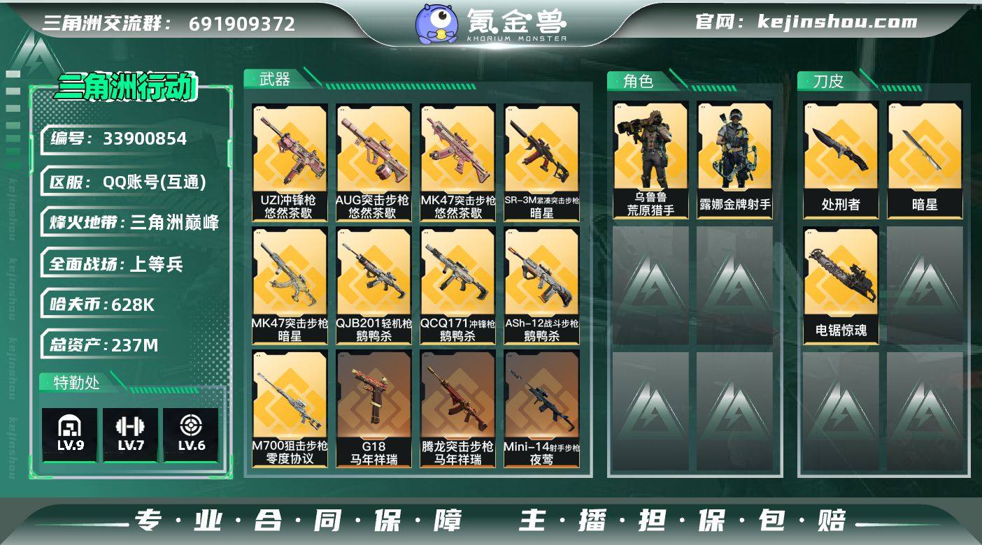 A12838/包人脸/QQ区【总资产:236.9M+近战暗星+近战电锯惊魂+近战处刑者+非洲之心+仓库9+体力7负重6】/烽火等级:60级/全面战场:34级/纯币:628K/三角券加币:411(三角币45+三角券366)【近战-暗星/近战-电锯惊魂/近战-处刑者】S7/S8通行证/露娜-金牌射手/乌鲁鲁-荒原猎手/部门:33322/特勤等级(技术中心3级/工作台3级/制药台3级/防具台3级/仓库9级/指挥中心6级/训练中心7级/靶场6级/潜水中心1级/收藏室1级)SR-3M紧凑突击步枪-暗星/MK47突击步枪-暗星/M4A1突击步枪-阿米娅/AKM突击步枪-锦绣/SG552突击步枪-运动员/G3战斗步枪-骑士/橙色挂饰x5/段位:三角洲巅峰X1(流动资产:192.1M)/详细看图