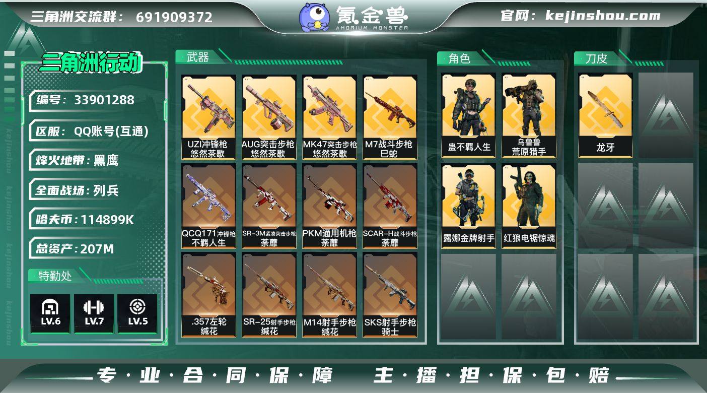【PTSJZ4699】总资产207M/哈夫币11489万/传说近战数1/传说枪皮数14/战场等级11/行动等级60/安全箱等时效性道具以游戏内数据为准,详情请看图/红狼-电锯惊魂/露娜-金牌射手(S7)/乌鲁鲁-荒原猎手/蛊-不羁人生/近战-龙牙/近战-黑鹰/AUG突击步枪-悠然茶歇/M7战斗步枪-巳蛇/SG552突击步枪-运动员/SCAR-H战斗步枪-荼蘼/MK47突击步枪-悠然茶歇/UZI冲锋枪-悠然茶歇/SR-3M紧凑突击步枪-荼蘼/QCQ171冲锋枪-不羁人生/PKM通用机枪-荼蘼/M14射手步枪-蛮荒/M14射手步枪-缄花/SKS射手步枪-骑士/SR-25射手步枪-缄花/.357左轮-缄花/QBZ95-1突击步枪-曙光/K416突击步枪-冬日风情/K416突击步枪-腊梅/K416突击步枪-阿萨拉特攻/K416突击步枪-缄默情歌/M7战斗步枪-百步穿杨/SG552突击步枪-哈夫克警备/G3战斗步枪-流沙送葬/AS Val突击步枪-百步穿杨/K437突击步枪-丛林谍踪/KC17突击步枪-缄默情歌/MP5冲锋枪-竞技风/Vector冲锋枪-猎鳄行动/Vector冲锋枪-百步穿杨/Vector冲锋枪-异域战争/SMG45冲锋枪-阿萨拉特攻/SR-3M紧凑突击步枪-开工大吉/勇士冲锋枪-丛林谍踪/MP7冲锋枪-六套之力/S12K霰弹枪-缄默情歌/M249轻机枪-丛林谍踪/QJB201轻机枪-炽焰/VSS射手步枪-丛林谍踪/M14射手步枪-工业狂潮/M14射手步枪...