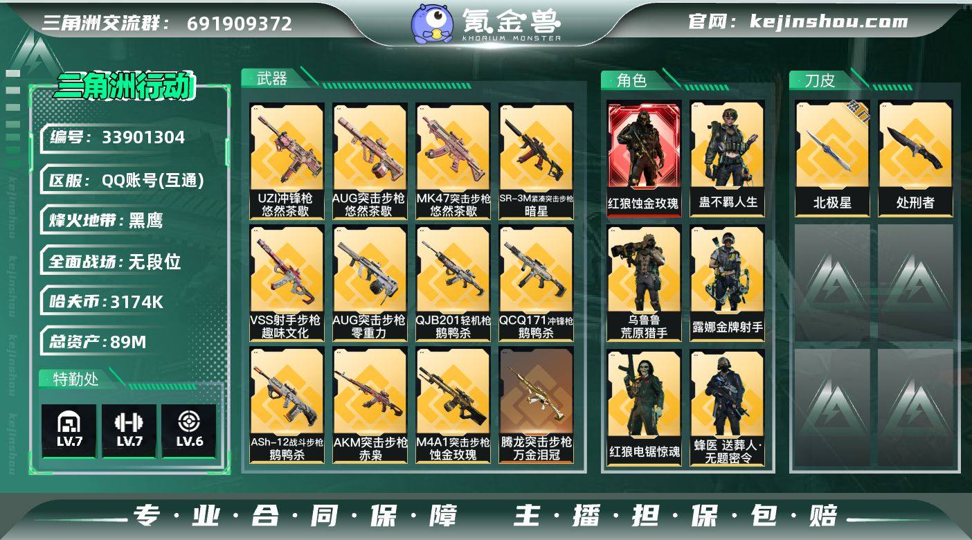 【PTSJZ5057】总资产89M/哈夫币317万/传说近战数1/传说枪皮数27/战场等级4/行动等级60/安全箱等时效性道具以游戏内数据为准,详情请看图/红狼-蚀金玫瑰/蜂医-送葬人·无题密令(S5)/红狼-电锯惊魂/露娜-金牌射手(S7)/乌鲁鲁-荒原猎手/蛊-不羁人生/近战-北极星/近战-处刑者/近战-黑鹰/M4A1突击步枪-蚀金玫瑰/M4A1突击步枪-阿米娅/AKM突击步枪-赤枭/AKM突击步枪-锦绣/ASh-12战斗步枪-鹅鸭杀/M16A4突击步枪-狩猎时刻/AUG突击步枪-零重力/AUG突击步枪-悠然茶歇/SG552突击步枪-运动员/SCAR-H战斗步枪-启航/G3战斗步枪-狩猎时刻/腾龙突击步枪-万金泪冠/K437突击步枪-锦绣/KC17突击步枪-电锯惊魂/MK47突击步枪-悠然茶歇/Vector冲锋枪-狩猎时刻/UZI冲锋枪-悠然茶歇/SMG-45冲锋枪-锦绣/SR-3M紧凑突击步枪-暗星/勇士冲锋枪-能天使-午夜邮差/QCQ171冲锋枪-鹅鸭杀/725双管霰弹枪-送葬人-无题密令/QJB201轻机枪-鹅鸭杀/M14射手步枪-蛮荒/VSS射手步枪-趣味文化/AWM狙击步枪-万金泪冠/复合弓-黑-天际线/SR-25射手步枪-天命(典藏)/KC17突击步枪-碎冰行动(典藏)/QBZ95-1突击步枪-曙光/K416突击步枪-腊梅/K416突击步枪-阿萨拉特攻/K416突击步枪-缄默情歌/M16A4突击步枪-竞赛选手/AUG突击步枪-蝮蛇/...