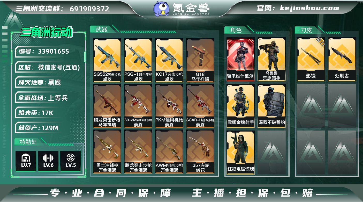 【PTSJZ4647】总资产129M/哈夫币1万/传说近战数1/传说枪皮数26/战场等级23/行动等级60/安全箱等时效性道具以游戏内数据为准,详情请看图/骇爪-维什戴尔/深蓝-不破誓约(S6)/红狼-电锯惊魂/露娜-金牌射手(S7)/乌鲁鲁-荒原猎手/近战-影锋/近战-处刑者/近战-黑鹰/M4A1突击步枪-阿米娅/K416突击步枪-行动记录/SG552突击步枪-运动员/SG552突击步枪-点翠/SCAR-H战斗步枪-启航/SCAR-H战斗步枪-荼蘼/G3战斗步枪-骑士/CAR-15突击步枪-阿米娅/腾龙突击步枪-马年祥瑞/腾龙突击步枪-万金泪冠/KC17突击步枪-电锯惊魂/KC17突击步枪-点翠/SR-3M紧凑突击步枪-荼蘼/勇士冲锋枪-万金泪冠/PKM通用机枪-荼蘼/M250通用机枪-骑士之心/M14射手步枪-蛮荒/M14射手步枪-缄花/SKS射手步枪-骑士/SR-25射手步枪-水墨云图/SR-25射手步枪-缄花/PSG-1射手步枪-点翠/R93狙击步枪-维什戴尔/AWM狙击步枪-万金泪冠/.357左轮-缄花/G18-马年祥瑞/ASh-12战斗步枪-无极限/K416突击步枪-冬日风情/K416突击步枪-腊梅/K416突击步枪-阿萨拉特攻/AUG突击步枪-蝮蛇/M7战斗步枪-百步穿杨/SG552突击步枪-哈夫克警备/SCAR-H战斗步枪-囚徒/G3战斗步枪-流沙送葬/G3战斗步枪-哈夫克警备/AS Val突击步枪-百步穿杨/腾龙突击步枪-猎鳄行...
