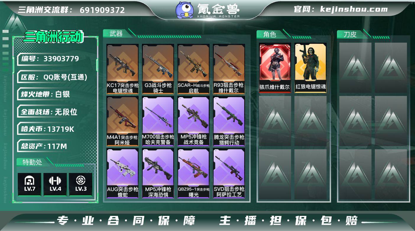 【AYS295】【特价出售/店主推荐】117m总资产-13719k哈伏币-60烽火等级-白银-1战场等级-无军衔 【干员外观】:骇爪-维什戴尔,红狼-电锯惊魂 【近战皮肤】:近战-黑鹰 【传说外观】:M4A1突击步枪-阿米娅,SCAR-H战斗步枪-启航,G3战斗步枪-骑士,KC17突击步枪-电锯惊魂,R93狙击步枪-维什戴尔 【史诗外观】:QBZ95-1突击步枪-曙光,AUG突击步枪-蝮蛇,腾龙突击步枪-猎鳄行动,MP5冲锋枪-深海恐惧,MP5冲锋枪-战术竞备,SVD狙击步枪-阿萨拉工艺,M700狙击步枪-哈夫克警备 【稀有外观】:M7战斗步枪-捣蛋鬼,SCAR-H战斗步枪-荣耀列队,腾龙突击步枪-冰天雪地,MP5冲锋枪-哈夫克卫队,MP5冲锋枪-精英联盟,P90冲锋枪-黄昏,P90冲锋枪-捣蛋鬼,UZI冲锋枪-亚特兰蒂斯,SMG-45-行动开启,勇士冲锋枪-冰天雪地,M1014霰弹枪-幻影结构,QJB201轻机枪-哈夫克卫队,Mini-14射手步枪-荣耀列队,SKS射手步枪-弄臣,SV-98狙击步枪-星链科技,SV-98狙击步枪-哈夫克航天,SV-98狙击步枪-精英联盟,G18-精英联盟 【普通外观】:M4A1突击步枪-粉色涂装,QBZ95-1突击步枪-高雅黑,QBZ95-1突击步枪-海浪,QBZ95-1突击步枪-海色,QBZ191突击步枪-三角洲力量,K416突击步枪-几何迷彩,K416突击步枪-...