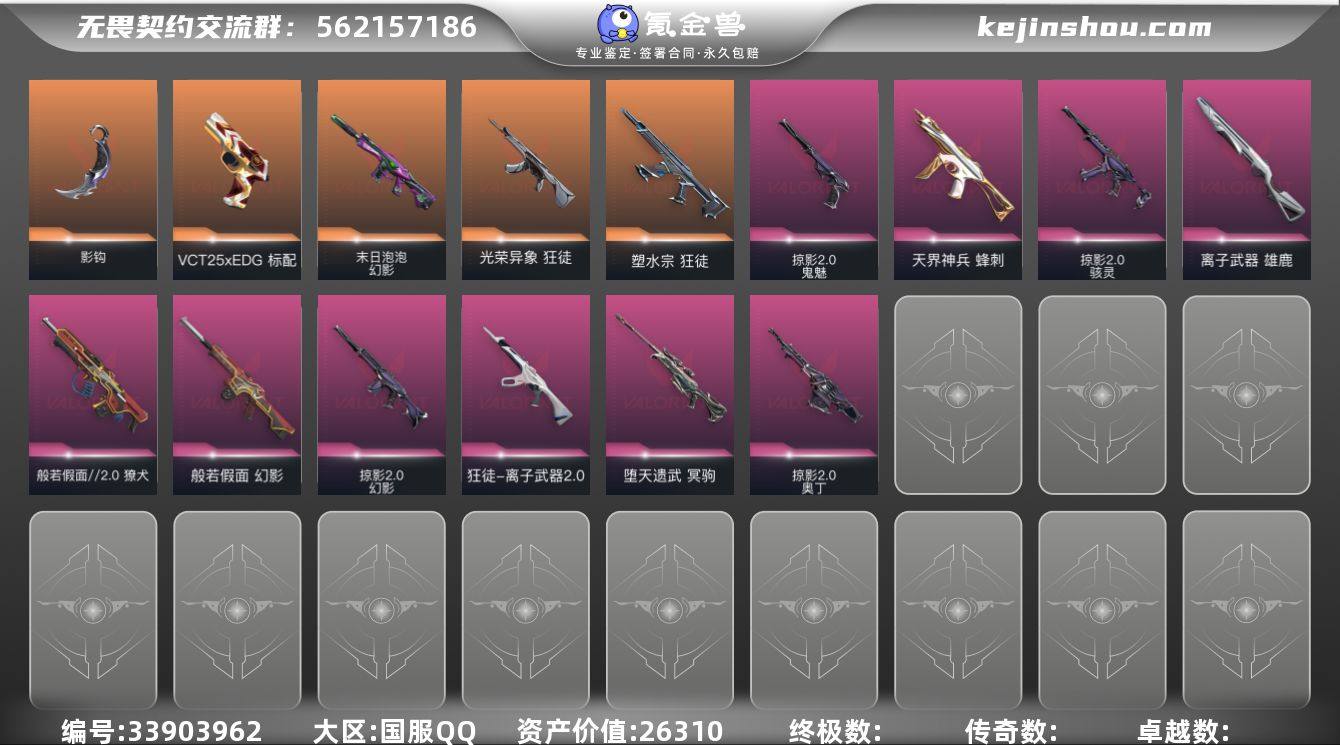 MWW659【游戏等级】Lv132 【段位】 未定级 【R点】840 【皮肤总价值】26,310 【英雄数量】27 【皮肤数量】70 【挂饰数量】57 【卡面数量】92 【喷漆数量】79 【正义】正义-奇点 【幻影】幻影-般若假面 幻影-末日泡泡 幻影-掠影//2.0 【獠犬】獠犬-般若假面//2.0 【标配】标配-VCT25xEDG 【雄鹿】雄鹿-离子武器 【冥驹】冥驹-堕天遗武 【蜂刺】蜂刺-天界神兵 【狂徒】狂徒-离子武器//2.0 狂徒-塑水宗 狂徒-光荣异象 【戍卫】戍卫-天界神兵 【鬼魅】鬼魅-掠影//2.0 【近战武器】近战武器-影钩 【奥丁】奥丁-掠影//2.0 【骇灵】骇灵-掠影//2.0