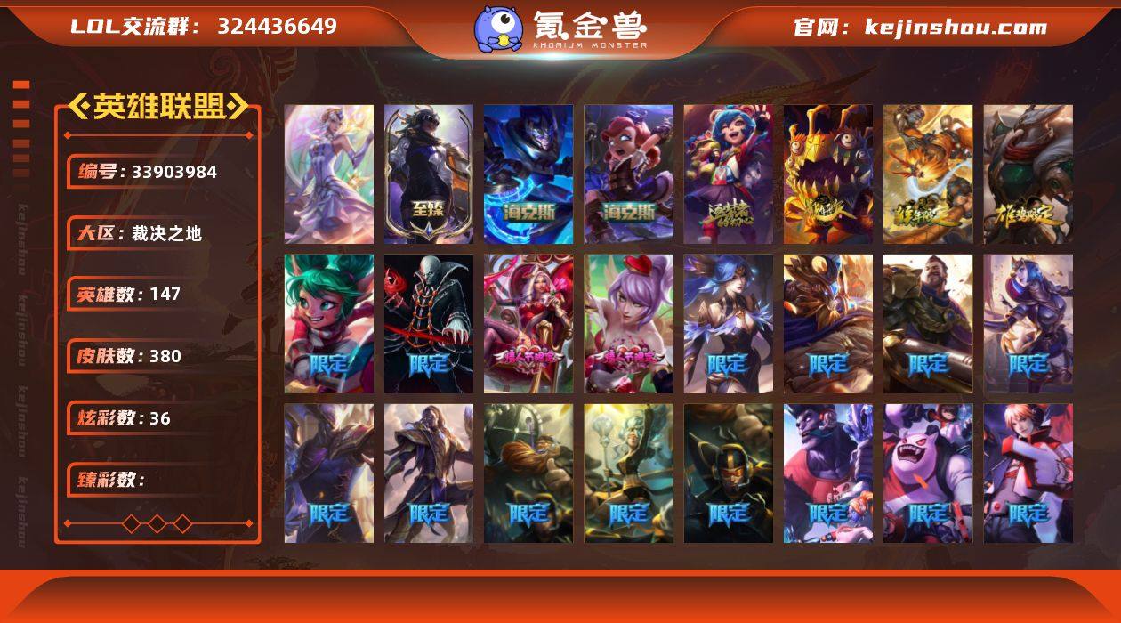 THL820【电信裁决之地 1终极 4神话 29传说 2臻彩】147英雄-380皮肤-36炫彩-段位:黄金【终极】大元素使【神话】海克斯科技安妮 至臻真实伤害赛娜 海克斯科技嘉文四世 十周年纪念安妮【臻彩】魅影之刃锐雯 霸天巨兽.雪崩墨菲特【皮肤】大元素使 泳池派对蕾欧娜 夺命美人卡特琳娜 机械迷城加里奥 防暴士兵炼金 地底世界崔斯特 都铎王朝老鼠 冠军之血希瓦娜 勇者阿狸 诺斯费拉图 弗拉基米尔 防暴士兵格雷福斯 泳池派对格雷福斯 警用试作体K-9内瑟斯 勇者豹女 波比的巧克力工坊 冠军典狱长锤石 女猎手希维尔 外星装甲库奇 野兽猎人德莱文 海克斯科技嘉文四世 海克斯安妮 龙年醒狮克格莫 蛇年库奇 马年锐雯 猴年美猴王孙悟空 鸡年司马懿仲达阿兹尔 10周年安妮 7周年艾瑞莉娅 觅心女王艾希 觅心之翼奎因 “主人不要我了”阿木木 冰雪节炼金 冰雪女神辛德拉 胡桃夹子小丑 平安夜女神琴女 魄罗骑士瑟庄妮 圣诞精灵崔丝塔娜 圣诞狂欢基兰 圣诞狂欢努努 圣诞老人酒桶 圣诞糖果棒女枪 圣诞玩偶波比 冰雪节茂凯 邪恶圣诞老人维迦 幸福女神乐芙兰 雪装豹女 英勇玩具兵普朗克 胜利之树茂凯 胜利枪神格雷福斯 胜利女神奥利安娜 胜利之剑剑魔 胜利枪神卢锡安 S1FNC酒桶 S1FNC迦娜 S1FNC嘉文四世...