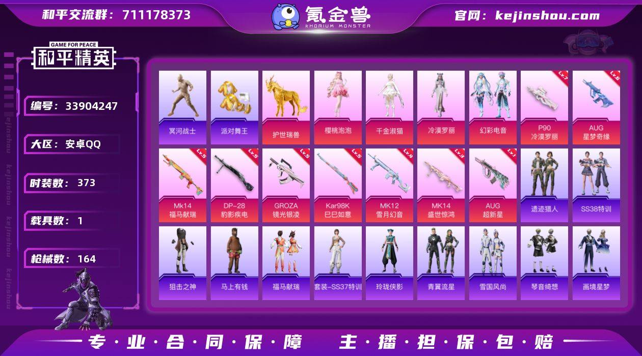 精氪地铁号/ss30战神框/ss36战神框【木乃伊/小番茄/金鞋/千金淑猫/樱桃泡泡】6级星梦奇缘/aug超新星/7级p90冷漠罗丽/菠萝头/地铁满天赋/金马 实名: 可修改 时装数: 373 载具数: 1 枪械数: 164 战备数: 130 热门装扮: 冥河战士,派对舞王,千金淑猫,樱桃泡泡,幻彩电音,冷漠罗丽 载具: 护世瑞兽 稀有枪皮: AUG超新星,AUG星梦奇缘,GROZA-镜光银凌,Kar98K-巳巳如意,MK14-盛世惊鸿,MK12-雪月幻音,P90-冷漠罗丽,DP-28-豹影疾电