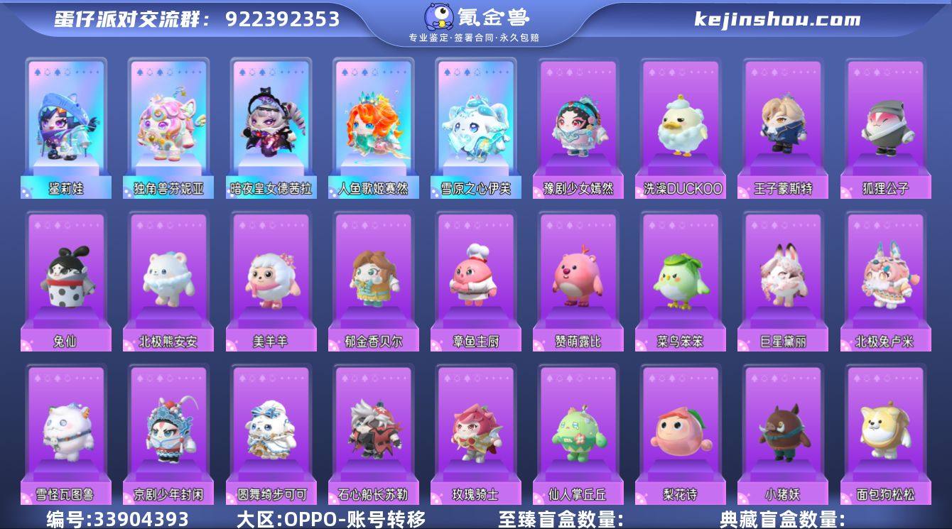 暗夜皇女德茜拉,独角兽芬妮亚,人鱼歌姬赛然,鲨莉娃,雪原之心伊芙 北极兔卢米,北极熊安安,菜鸟笨笨,狐狸公子,京剧少年封闲,巨星黛丽,梨花诗,面包狗松松,玫瑰骑士,美羊羊,石心船长苏勒,兔仙,王子蒙斯特,雪怪瓦图鲁,小灰灰,仙人掌丘丘,洗澡DUCKOO,小猪妖,豫剧少女嫣然,郁金香贝尔,圆舞绮步可可,赞萌露比,章鱼主厨 段位:三阶鸡蛋