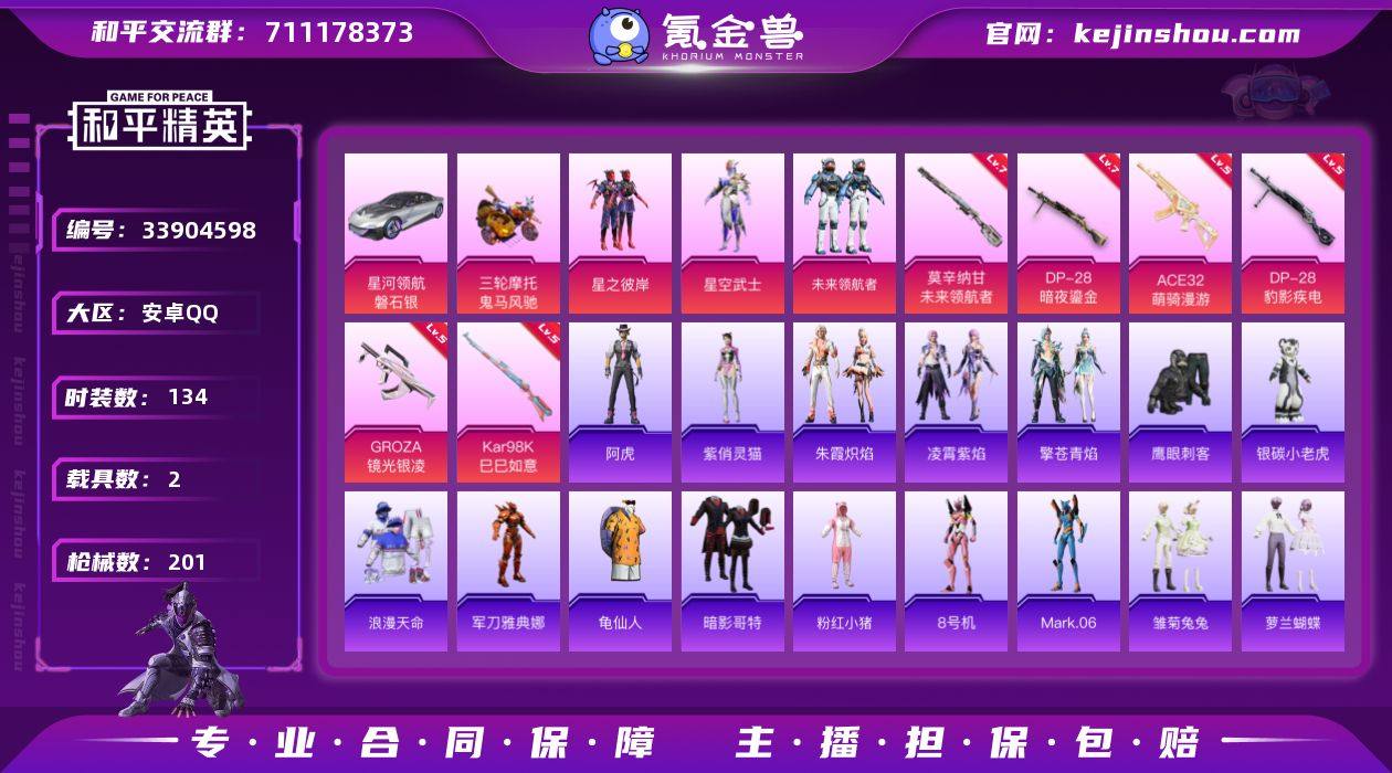 安卓手Q-和平一体号附赠王者-3粉装-6特效枪-2载具-5粉色飞行器-62535热力值-11王牌印记-134套装-201枪皮-V7-永恒钻石II段位-128英雄-181皮肤-1典藏皮肤-3传说-45史诗HZ2642506 【热门品类】:套装-浪漫天命,角色-军刀雅典娜,套装-龟仙人,套装-暗影哥特,套装-粉红小猪,角色-8号机,角色-Mark.06 【粉色套装】:粉装-星之彼岸,角色-星空武士,粉装-未来领航者 【粉色枪皮等级】:GROZA-镜光银凌(五级),ACE32-萌骑漫游(五级),Kar98K-巳巳如意(五级),莫辛纳甘-未来领航者(七级),DP-28-暗夜鎏金(七级),DP-28-豹影疾电(五级) 【粉色载具】:星河领航(磐石银),鬼马风驰 【粉色枪皮】:GROZA-镜光银凌,ACE32-萌骑漫游,Kar98K-巳巳如意,莫辛纳甘-未来领航者,DP-28-暗夜鎏金,DP-28-豹影疾电 【英雄全皮】:孙权全皮 【荣耀典藏】:铠银白咏叹调 【传说皮肤】:典韦战鼓燎原,澜逐花归海,李元芳飞鸢探春 【粉色飞行器】:星夜魔法师飞行翼,繁龙极客飞行器,深渊漩涡飞行器,飞天猪飞行器,极意拳锋飞行器 【粉色降落伞】:甜心宝贝降落伞,洛神天依降落伞,炙焰牛王降落伞,环太平洋降落伞,垂柳戏鸭降落伞,太空嘟嘟降落伞,旋转彩虹降落伞,暗夜鎏金降落伞,音爆...