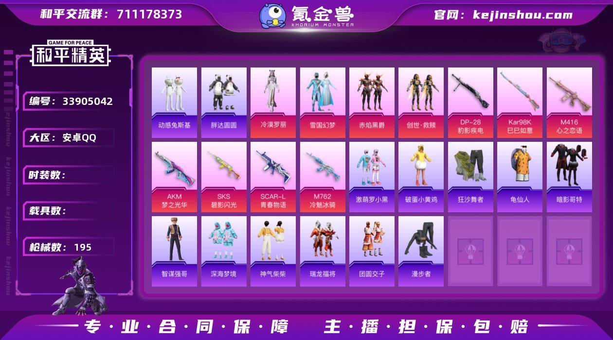 0载具-126套装-195枪皮-安卓手Q-包人脸-雪国小号-13王牌印记-5粉装-9特效枪-60659热力值-126套装-195枪皮-2卓越印记-1传奇印记【5粉装】套装-创世·救赎,角色-虎痴许褚,套装-雪国幻梦,套装-赤焰黑爵,角色-冷漠罗丽【9特效枪】AA12-G-萌骑幻想/4级,SCAR-L-青春物语/5级,SKS-碧影闪光/4级,M416-心之恋语/6级,Kar98K-巳巳如意/5级,M762-冷魅冰骑/6级,AKM-梦之光华/5级,DP-28-豹影疾电/5级,Mk14-福马献瑞/5级【3稀有紫装】暗影哥特,胖达圆圆,龟仙人【123稀有时装】雪国幻梦,虎痴许褚,冷漠罗丽,赤焰黑爵,创世·救赎,SS38特训,龟仙人,暗影哥特,胖达圆圆,激萌罗小黑,动感兔斯基人偶服,狂沙舞者,龙宫之主,萌趣咩咩,龙魂突击队,霜刃之御,白糯汤圆,星渊小夜曲,鱼渊荷华,燕燕于飞,战术大师,智谋强哥,紫俏灵猫,香桃花海,巳巳如意,粉日山川,湖畔霞光,午间小调,彩虹兔,时希公主,雪绒豹,星影赞美诗,朱霞炽焰,凌霄紫焰,炫彩糖果,萌鸡速递,风迹短诗,秘语星愿,云朵鹅,恋语绒绒,青翼流星,马上来财,SS35特训,SS29特训,SS31特训,SS33特训,SS32特训,SS36特训,英勇保护者,福星高照,虎虎生威吉莉,龙的传人,潮流炫酷,SS37特训,SS28特训,飞驰魅影,白色伏地魔,音速流光,酒红色名流,阳光火鸡,涂山之恋,SS26特...