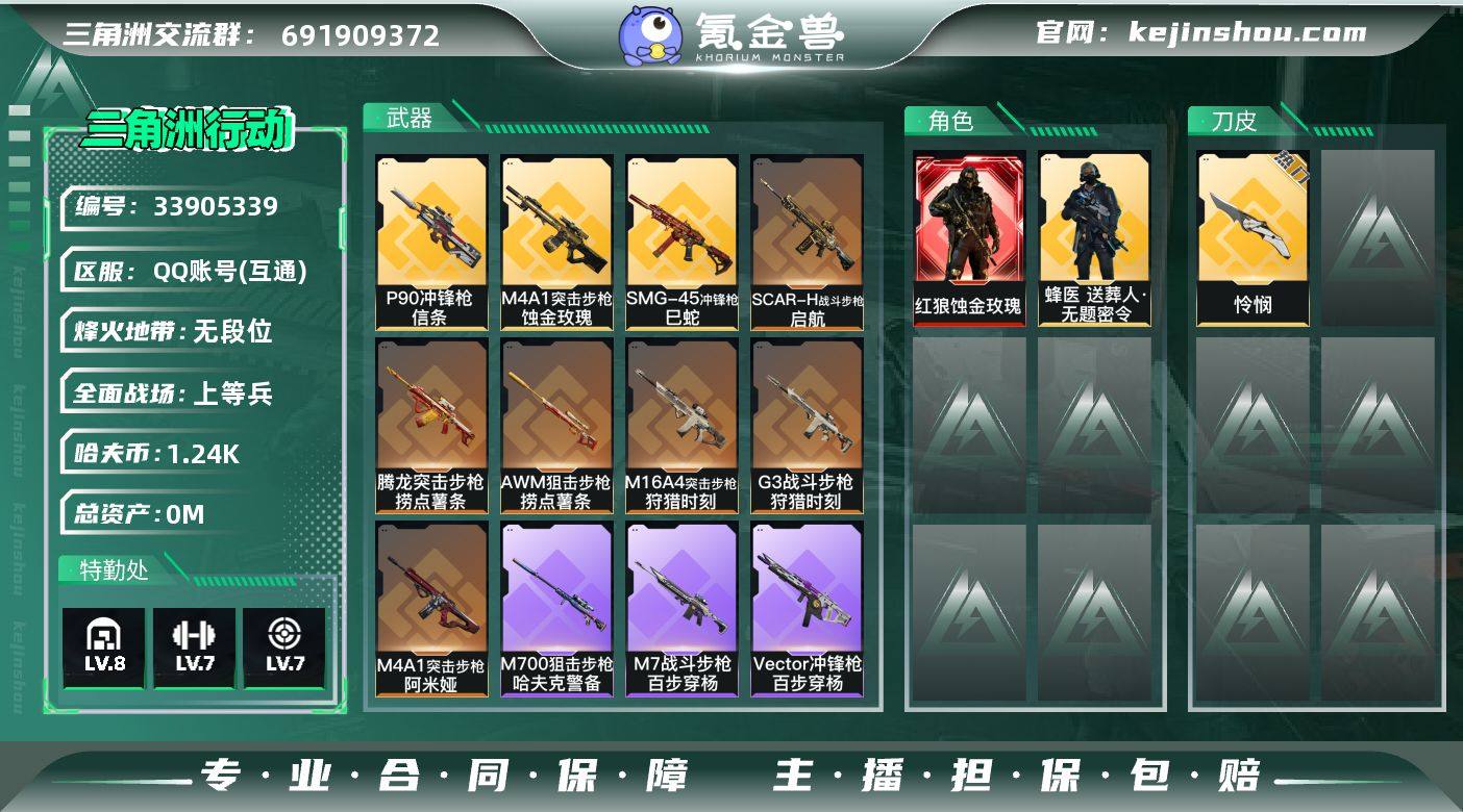 【SJZX1568】总资产67M/哈夫币124万/传说近战数1/传说枪皮数20/战场等级21/行动等级60/安全箱等时效性道具以游戏内数据为准,详情请看图/红狼-蚀金玫瑰/蜂医-送葬人·无题密令(S5)/深蓝-不破誓约/红狼-电锯惊魂/露娜-金牌射手/近战-信条/近战-怜悯/黑鹰/M4A1突击步枪-蚀金玫瑰/M4A1突击步枪-阿米娅/M16A4突击步枪-狩猎时刻/SG552突击步枪-运动员/SCAR-H战斗步枪-启航/G3战斗步枪-狩猎时刻/腾龙突击步枪-捞点薯条/KC17突击步枪-电锯惊魂/47突击步枪-暗星/P90冲锋枪-信条/Vector冲锋枪-狩猎时刻/SMG45冲锋枪-骑士/勇士冲锋枪-能天使-午夜邮差/725双管霰弹枪-送葬人-无题密令/M250通用机枪-骑士之心/M14射手步枪-蛮荒/SKS射手步枪-骑士/SR-25射手步枪-信条/AWM狙击步枪-捞点薯条/93R-捞点薯条/AKM突击步枪林中猎手/ASh-12战斗步枪-无极限/K416突击步枪-冬日风情/K416突击步枪-阿萨拉特攻/M16A4突击步枪-竞赛选手/AUG突击步枪-蝮蛇/M7战斗步枪-百步穿杨/SG552突击步枪深海恐惧/SCAR-H战斗步枪-囚徒/G3战斗步枪-流沙送葬/AS Val突击步枪-典狱官/AS Val突击步枪-百步穿杨/腾龙突击步枪-无垢/K437突击步枪-守护者/MP5冲锋枪深海恐惧/MP5冲锋枪-战术竞备/MP5冲锋枪-竞技风/Vector冲锋枪...