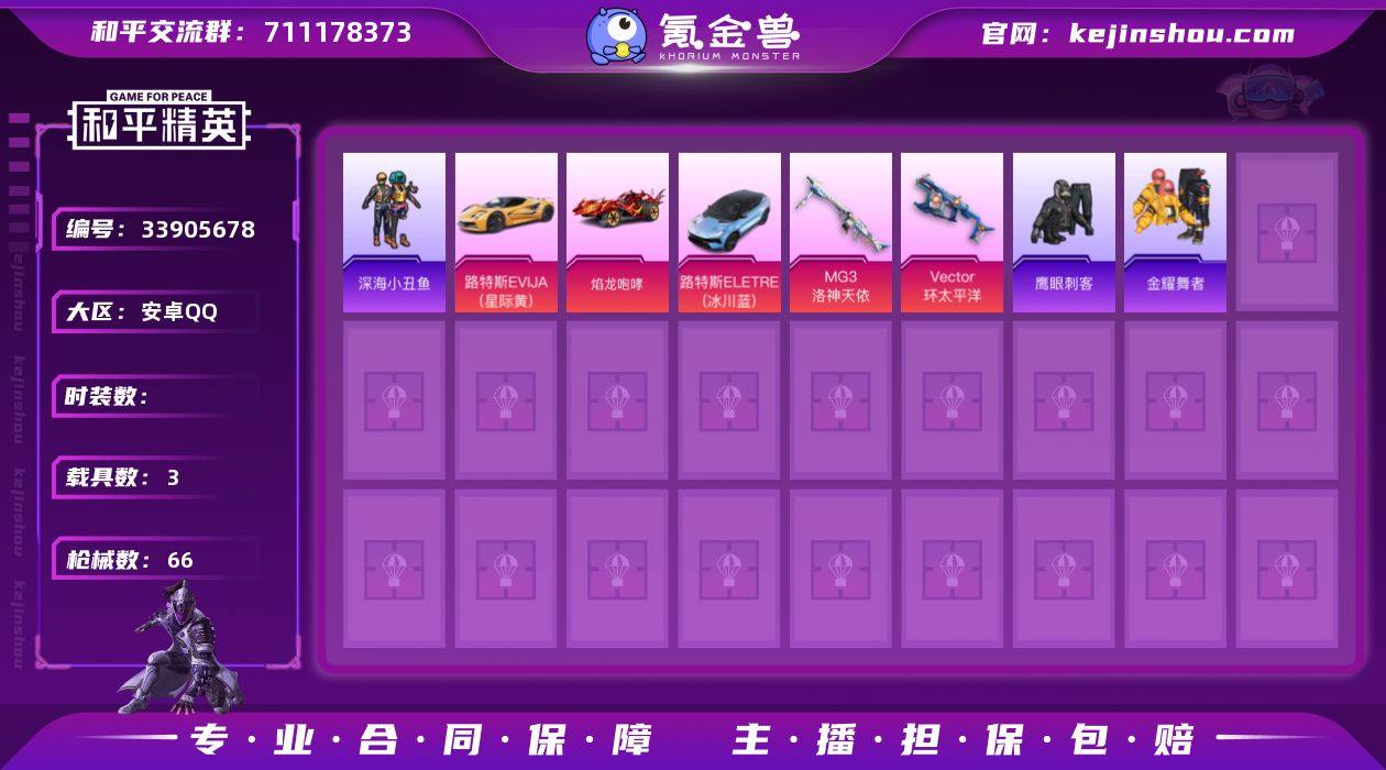 3载具-42套装-66枪皮-安卓手Q-包人脸-车皮小号-4王牌印记-2特效枪-3载具-21014热力值-42套装-66枪皮【2特效枪】MG3-洛神天依/1级,Vector-环太平洋/5级【1稀有紫装】深海小丑鱼【3稀有载具】路特斯ELETRE(冰川蓝),路特斯EVIJA(星际黄),焰龙咆哮【42稀有时装】深海小丑鱼,萌趣咩咩,夏日音浪,白熊同盟,特训学院,沁蓝冰爽,飞驰魅影,音速流光,湖蓝色名流,黑色伏地魔,黎明保卫者,炫蓝之夏,竞技名士,猛禽,长空猛禽,魅力单车,猎梦纪元,甜心亚梦,虚音幻奏,幻世战舞者,牛气满满,娇憨猪猪,麻辣教官,鹰眼刺客,冰冻风暴,绮丽涂鸦,田园牧歌,轻风白浪,耀粉歌者,探宝勇士,牛气冲天,SS18特训,金耀舞者,蓝调潮人,SS19特训,SS20特训,SS21特训,玉兔迎春,SS22特训,SS23特训,甜蜜熊情侣,格斗先锋【66稀有枪械】Vector-环太平洋/5级,MG3-洛神天依/1级,M416-红色方程式,M416-蓝色火焰,AKM-影袭,AKM-灼热熔岩,AKM-霓虹街区,SCAR-L-红色方程式,SCAR-L-玉兔迎春,M16A4-红色方程式,M16A4-幻世战舞者,M16A4-甜心亚梦,GROZA-影袭,GROZA-田园牧歌,GROZA-彩虹符号,AUG-耀粉歌者,QBZ-飞驰魅影,M762-彩虹符号,M762-奇异狩猎者,Mk47-乌木金纹,AC-VAL-天降萌叽,AC-VAL-甜心亚梦,蜜獾-垂柳戏鸭,蜜獾-娇憨猪猪,Kar98K...