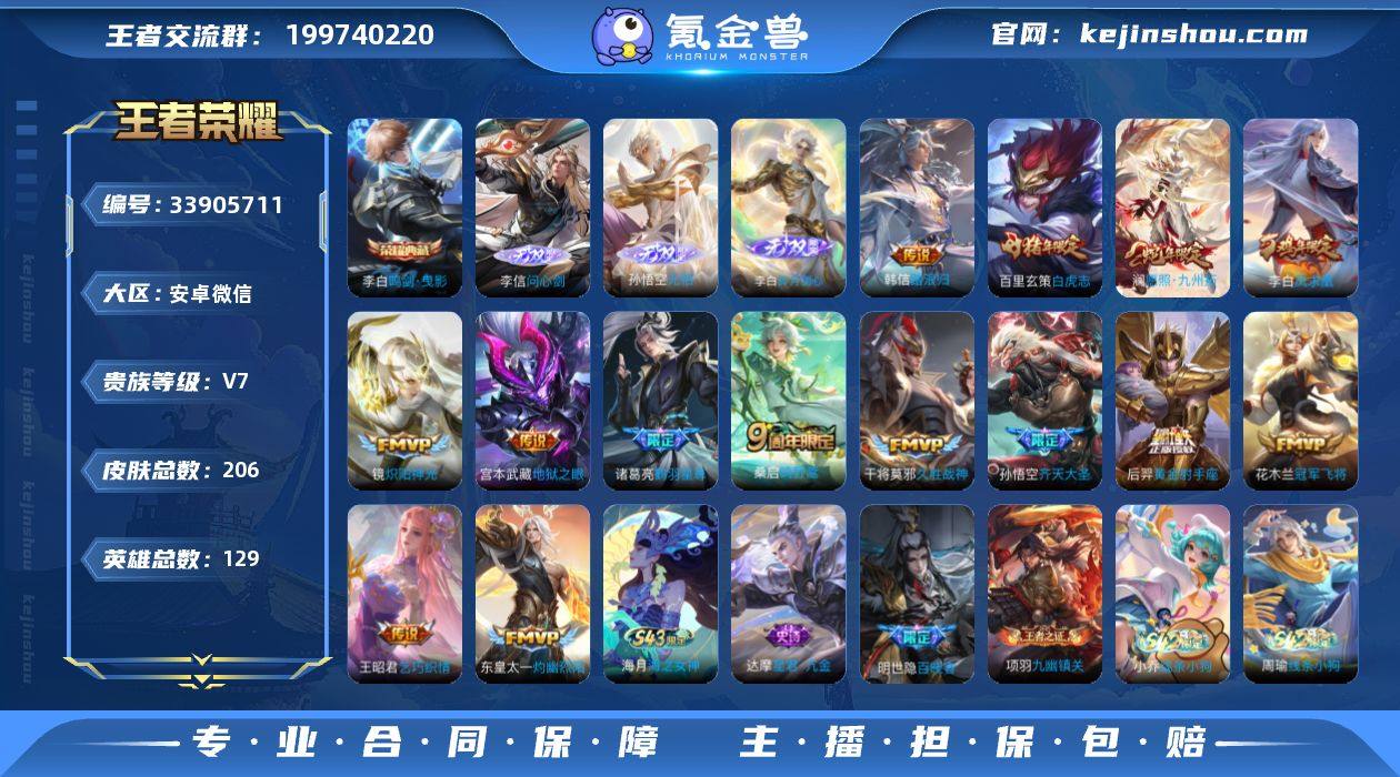 【v7 206皮 1典藏 李白 3无双 李信 孙悟空 李白 14传说 2星传说】实名: 可修改 贵族等级: V7 英雄数: 129 皮肤数: 206 荣耀水晶: 鸣剑·曳影 无双皮: 碎月剑心,无相,问心剑 传说皮: 黄金射手座,冠军飞将,久胜战神,炽阳神光,地狱之眼,乞巧织情,鹤羽星尊,灼幽烈阳,踏浪归 限定皮: 冰霜恋舞曲,凤求凰,白虎志,降魔,齐天大圣,鸣野蒿,逐霄战戟,愿照·九州拓