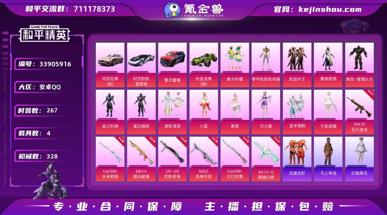 安卓 手Q-13粉装-7特效枪-4载具-6粉色飞行器-109955热力值-20王牌印记-267套装-328枪皮 【热门品类】:角色-军刀雅典娜,套装-SS1特训,角色-忠真马岱,角色-忠义严颜,套装-龟仙人,角色-8号机,大砍刀-青龙偃月刀 【粉色套装】:粉装-香水柠檬,角色-零号机款机体服,粉装-炙焰牛王,粉装-黄族统领,角色-猩猩队长,角色-宙之时溯,角色-星云暗核,粉装-莲影清波,角色-小蓝,角色-美雪,角色-引力星,粉装-金丰海韵,角色-千金淑猫 【粉色枪皮等级】:M416-五爪金龙(七级),Kar98K-未来歌姬(六级),Kar98K-巳巳如意(四级),Mk14-福马献瑞(五级),AA12-G-萌骑幻想(三级),DP-28-豹影疾电(五级),MG3-洛神天依(五级) 【粉色载具】:玛莎拉蒂Ghibli(粉),时空跃影(星辉银),擎天重拳,合金龙骨(绿) 【粉色枪皮】:M416-五爪金龙,Kar98K-未来歌姬,Kar98K-巳巳如意,Mk14-福马献瑞,AA12-G-萌骑幻想,DP-28-豹影疾电,MG3-洛神天依 【粉色飞行器】:炫彩糖果飞行器,潮汐统领飞行器,齐天大圣飞行器,天之羽翼飞行器,冠军兔兔飞行器,六号石头人降落伞 【粉色降落伞】:深海曼妙降落伞,绝对恒星降落伞,至尊龙雀降落伞,梦幻火箭降落伞,炫紫旋律降落伞,银刃赛罗降落...