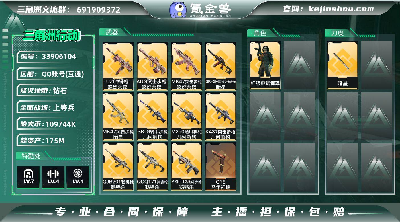 【PTSJZ4420】总资产175M/哈夫币10974万/传说近战数1/传说枪皮数34/战场等级15/行动等级60/安全箱等时效性道具以游戏内数据为准,详情请看图/红狼-电锯惊魂/近战-暗星/近战-黑鹰/M4A1突击步枪-阿米娅/ASh-12战斗步枪-鹅鸭杀/K416突击步枪-行动记录/AUG突击步枪-悠然茶歇/SCAR-H战斗步枪-启航/SCAR-H战斗步枪-荼蘼/G3战斗步枪-骑士/CAR-15突击步枪-阿米娅/腾龙突击步枪-捞点薯条/腾龙突击步枪-马年祥瑞/K437突击步枪-几何解构/KC17突击步枪-电锯惊魂/MK47突击步枪-悠然茶歇/MK47突击步枪-暗星/Vector冲锋枪-夜莺/UZI冲锋枪-悠然茶歇/SR-3M紧凑突击步枪-暗星/SR-3M紧凑突击步枪-荼蘼/勇士冲锋枪-能天使-午夜邮差/QCQ171冲锋枪-鹅鸭杀/MK4冲锋枪-夜莺/PKM通用机枪-荼蘼/M250通用机枪-几何解构/QJB201轻机枪-鹅鸭杀/Mini-14射手步枪-夜莺/M14射手步枪-蛮荒/M14射手步枪-缄花/SKS射手步枪-骑士/SR-25射手步枪-缄花/SR-9射手步枪-几何解构/AWM狙击步枪-捞点薯条/.357左轮-缄花/G18-马年祥瑞/93R-捞点薯条/K416突击步枪-冬日风情/K416突击步枪-腊梅/SG552突击步枪-深海恐惧/SG552突击步枪-哈夫克警备/G3战斗步枪-哈夫克警备/腾龙突击步枪-猎鳄行动/K437突击步枪-丛林谍踪/MP5冲锋枪-...