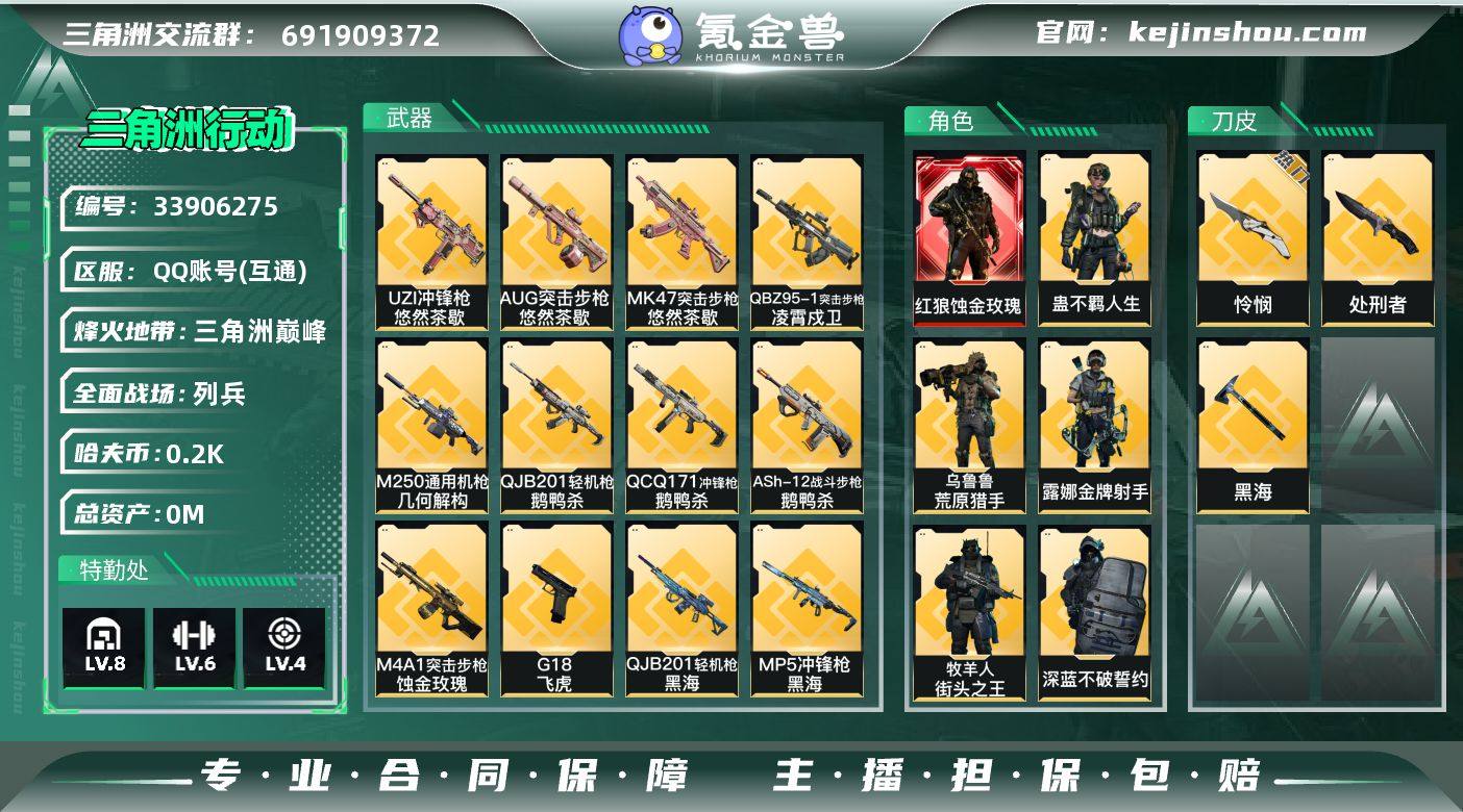 实名: 不可修改 烽火地带段位: 三角洲巅峰 全面战场段位: 列兵 总资产: 20 哈夫币: 203 干员外观: 威龙-铁面判官(S1),红狼-蚀金玫瑰,牧羊人-街头之王(S2),威龙-壮志凌云(S3),无名-夜鹰(S4),威龙-飞虎,蜂医-送葬人·无题密令(S5),深蓝-不破誓约(S6),露娜-金牌射手(S7),乌鲁鲁-荒原猎手,蛊-不羁人生 传说武器皮肤: QBZ95-1突击步枪-破军,M4A1突击步枪-蚀金玫瑰,近战-怜悯,M7战斗步枪-维京,SR-25射手步枪-水墨云图,QJB201轻机枪-黑海,MP5冲锋枪-黑海,近战-黑海,AK-12突击步枪-夜鹰,SMG45冲锋枪-骑士,G18-飞虎,725双管霰弹枪-送葬人-无题密令,M4A1突击步枪-阿米娅,CAR-15突击步枪-阿米娅,复合弓-黑-天际线,Vector冲锋枪-狩猎时刻,G3战斗步枪-狩猎时刻,M16A4突击步枪-狩猎时刻,AWM狙击步枪-捞点薯条,腾龙突击步枪-捞点薯条,93R-捞点薯条,AK-12突击步枪-特斯拉线圈,勇士冲锋枪-能天使-午夜邮差,M250通用机枪-骑士之心,SCAR-H战斗步枪-启航,ASh-12战斗步枪-鹅鸭杀,QCQ171冲锋枪-鹅鸭杀,QJB201轻机枪-鹅鸭杀,M250通用机枪-几何解构,G3战斗步枪-骑士,SG552突击步枪-运动员,SKS射手步枪-骑士,近战-处刑者,M14射手步枪-蛮荒,QBZ95-1突击步枪-凌霄戍卫,K416突击步枪-行动记录,腾龙突击步枪-...
