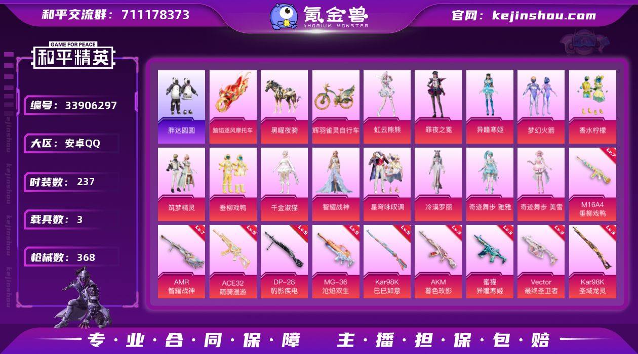 【kyhp1183】安卓 手Q-13粉装-13特效枪-3载具-9粉色飞行器-116829热力值-15王牌印记-237套装-368枪皮 【热门品类】:粉装-梦幻火箭,角色-军刀雅典娜,套装-胖达圆圆,套装-粉红小猪 【粉色套装】:粉装-梦幻火箭,粉装-香水柠檬,粉装-筑梦精灵,粉装-垂柳戏鸭,角色-千金淑猫,角色-智耀战神,粉装-星穹咏叹调,角色-冷漠罗丽,角色-奇迹舞步 雅雅,角色-奇迹舞步 美雪,角色-异瞳寒姬,角色-罪夜之冕,角色-虹云熊熊 【粉色枪皮等级】:AKM-暮色玫影(三级),M16A4-垂柳戏鸭(七级),蜜獾-异瞳寒姬(三级),ACE32-萌骑漫游(五级),Vector-最终圣卫者(三级),Kar98K-巳巳如意(五级),Kar98K-圣域龙灵(三级),Mk14-福马献瑞(一级),AMR-智耀战神(七级),DP-28-豹影疾电(五级),MG3-洛神天依(一级),MG3-辉羽雀灵(三级),MG-36-沧焰双生(五级) 【粉色载具】:踏焰逐风摩托车,僚机-圣域龙宝,黑曜夜骑,辉羽雀灵自行车 【粉色枪皮】:AKM-暮色玫影,M16A4-垂柳戏鸭,蜜獾-异瞳寒姬,ACE32-萌骑漫游,Vector-最终圣卫者,Kar98K-巳巳如意,Kar98K-圣域龙灵,Mk14-福马献瑞,AMR-智耀战神,DP-28-豹影疾电,MG3-洛神天依,MG3-辉羽雀灵,MG-36-沧焰双生 【粉色飞行器】:炫彩糖果飞...