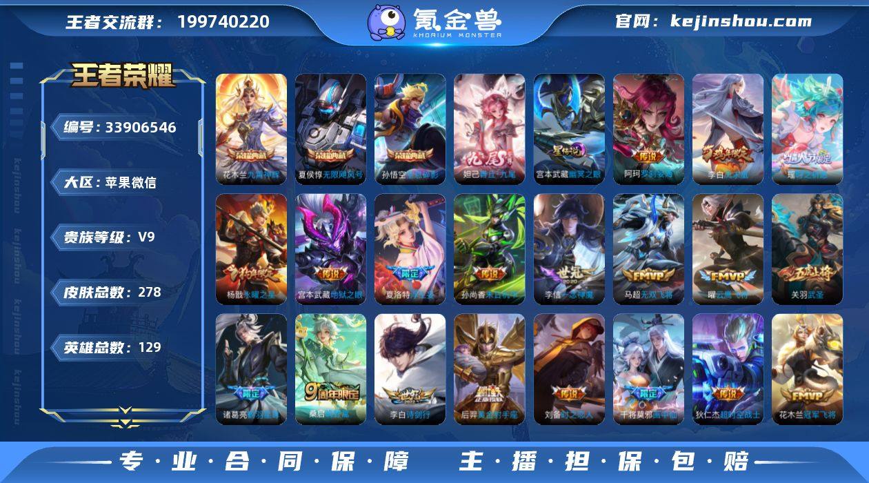 【精品推荐·全息碎影·无限飓风号·九霄神辉·青丘九尾·罗刹妄海·鹤羽星尊·电玩雷克斯·张飞百相守梦·浮生妄·画中仙·时之祈愿·启明星使·武圣·云鹰飞将·一念神魔·时之恋人·永曜之星·凤求凰·埋骨钱·龙胆·至尊宝·天狼征服者·玄武志·青龙志·凤鸣九霄天幕·可二次】YXw24356-苹果WX-129英雄-278皮肤-4王者印记-260铭文-贵族积分15w【贵族9】【3典藏·1无双·1星传说·28传说·1天幕·3按键】【因赛季更新游戏段付以上号为准!】 【英雄全皮】:孙权全皮,敖隐全皮,金蝉全皮 【荣耀典藏】:孙悟空全息碎影,夏侯惇无限飓风号,花木兰九霄神辉 【无双皮肤】:妲己青丘九尾 【星元皮肤】:宫本武藏幽冥之眼 【天幕】:凤鸣九霄天幕 【传说皮肤】:阿轲罗刹妄海,桑启鸣野蒿,诸葛亮鹤羽星尊,澜电玩雷克斯,张飞百相守梦,夏洛特浮生妄,干将莫邪画中仙,李白诗剑行,马超无双飞将,瑶时之祈愿,周瑜音你心动,李元芳飞鸢探春,铠绛天战甲,虞姬启明星使,关羽武圣,曜云鹰飞将,李信一念神魔,刘备时之恋人,张良黄金白羊座,花木兰冠军飞将,梦奇胖达荣荣,后羿黄金射手座,杨戬永曜之星,李白凤求凰,孙尚香末日机甲,宫本武藏地狱之眼,孙悟空地狱火,狄仁杰超时空战士 【限定皮肤】:白起狰...