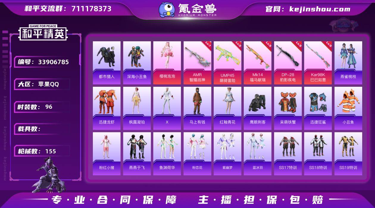 【kyhp1857】苹果 手Q-1粉装-5特效枪-0载具-1粉色飞行器-41970热力值-3王牌印记-96套装-155枪皮 【热门品类】:套装-都市猎人,套装-深海小丑鱼,套装-小丑鱼,套装-粉红小猪 【粉色套装】:角色-樱桃泡泡 【粉色枪皮等级】:UMP45-萌骑冒险(五级),Kar98K-巳巳如意(五级),Mk14-福马献瑞(五级),AMR-智耀战神(七级),DP-28-豹影疾电(五级) 【粉色枪皮】:UMP45-萌骑冒险,Kar98K-巳巳如意,Mk14-福马献瑞,AMR-智耀战神,DP-28-豹影疾电 【粉色飞行器】:炫彩糖果飞行器 【粉色降落伞】:幻影战神降落伞,鸢尾晶梦降落伞,创世·救赎降落伞,炫彩糖果降落伞 【稀有套装】:套装-炫彩糖果,角色-X,套装-马上有钱,套装-迅捷龙虾,套装-燕燕于飞,套装-鱼渊荷华,套装-粉恋花,套装-紫幽梦,套装-蓝冰羽,套装-雨过天青,套装-红釉青花,角色-枫露凝珀,套装-燕雀桃枝 【稀有枪皮】:AKM-影袭,AKM-生命誓言,AKM-缤纷海域,AKM-萌趣颜团子,AKM-虎虎生威,AKM-龙的传人,M16A4-幻世战舞者,M16A4-蓝色火焰,SCAR-L-夜灯,SCAR-L-暗夜玫瑰,SCAR-L-红色方程式,SCAR-L-小狗蛇点点,SCAR-L-绶带小兔,M416-动感兔斯基,M416-糯团青竹,M416-绯红前夜,M416-蓝色火焰,GROZA-影袭...