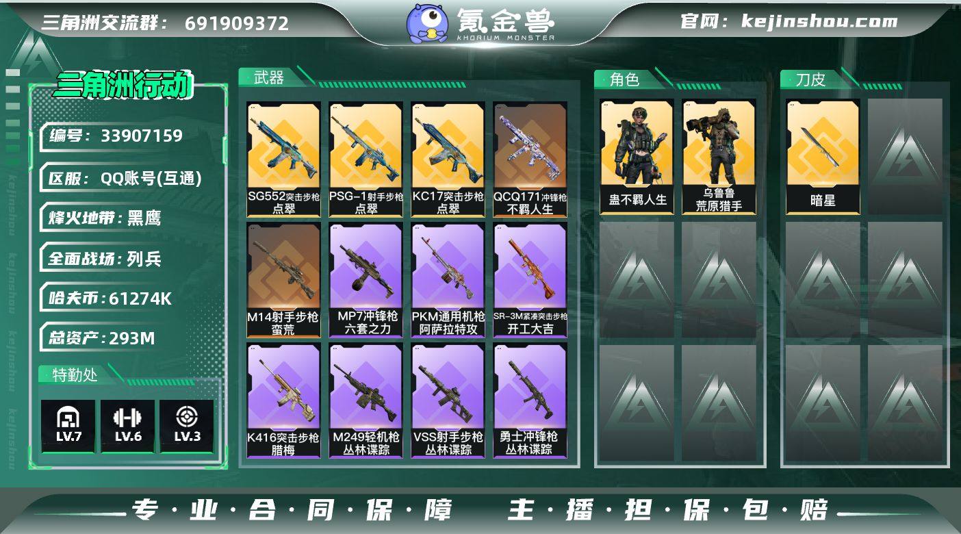 【PTSJZ4531】总资产293M/哈夫币6127万/传说近战数1/传说枪皮数5/战场等级7/行动等级60/安全箱等时效性道具以游戏内数据为准,详情请看图/乌鲁鲁-荒原猎手/蛊-不羁人生/近战-暗星/近战-处刑者3级/近战-黑鹰/SG552突击步枪-点翠/KC17突击步枪-点翠/QCQ171冲锋枪-不羁人生/M14射手步枪-蛮荒/PSG-1射手步枪-点翠/K416突击步枪-腊梅/K437突击步枪-丛林谍踪/MP5冲锋枪-深海恐惧/SR-3M紧凑突击步枪-开工大吉/勇士冲锋枪-丛林谍踪/MP7冲锋枪-六套之力/PKM通用机枪-阿萨拉特攻/M249轻机枪-丛林谍踪/QJB201轻机枪-炽焰/VSS射手步枪-丛林谍踪/M700狙击步枪-蝮蛇/M700狙击步枪-极地勘察队/SG552突击步枪-马年新春/SG552突击步枪-贴花艺术/ AK-12突击步枪-马年新春/CAR-15突击步枪-来财/KC17突击步枪-来财/SMG-45冲锋枪-行动开启/SMG-45冲锋枪-幻影结构/SR-3M紧凑突击步枪-马年新春/M1014霰弹枪-幻影结构/Mini-14射手步枪-来财/QSZ92G-一帆风顺/M4A1突击步枪-粉色涂装/M4A1突击步枪-高雅黑/QBZ95-1突击步枪-高雅黑/QBZ95-1突击步枪-海浪/K416突击步枪-重击/M16A4突击步枪-高雅黑/M16A4突击步枪-出货/M7战斗步枪-重击/M7战斗步枪-黑巧甜心/SG552突击步枪-海浪/SG552突击步枪-狂欢/PTR-32突...