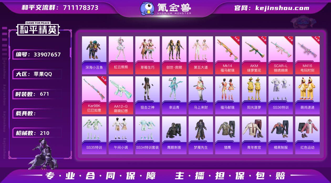 实名: 不可修改 时装数: 671 枪械数: 210 热门装扮: 深海小丑鱼,梦魇先生,鹰眼刺客,草莓生巧,第五大道,创世·救赎,虹云熊熊 稀有枪皮: AKM绿萝繁花,SCAR-L-锦绣绵绵,M416电玩时刻,Kar98K-巳巳如意,MK14-福马献瑞,AA12-G-萌骑幻想 亮点: 【优质装备】:虹云熊熊