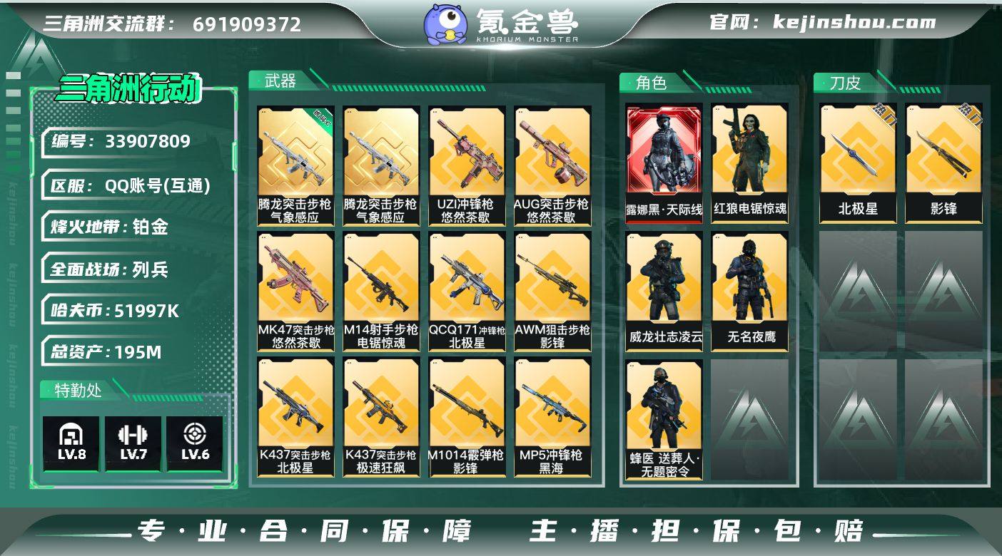 195m总资产-51997k哈夫币-60烽火等级-铂金-11战场等级-列兵【干员外观】:露娜-黑·天际线,威龙-壮志凌云,蜂医-送葬人·无题密令,无名-夜鹰,红狼-电锯惊魂【近战皮肤】:近战-北极星,近战-影锋,近战-黑鹰【典藏外观】:腾龙突击步枪-气象感应【典藏外观成色】:腾龙突击步枪-气象感应(优品C)【传说外观】:M4A1突击步枪-阿米娅,AUG突击步枪-悠然茶歇,AK-12突击步枪-夜鹰,AK-12突击步枪-特斯拉线圈,SCAR-H战斗步枪-铁艺苍穹,SCAR-H战斗步枪-启航,CAR-15突击步枪-黑鹰坠落,CAR-15突击步枪-阿米娅,腾龙突击步枪-捞点薯条,腾龙突击步枪-万金泪冠,K437突击步枪-极速狂飙,K437突击步枪-北极星,KC17突击步枪-电锯惊魂,MK47突击步枪-悠然茶歇,MP5冲锋枪-黑海,UZI冲锋枪-特斯拉线圈,UZI冲锋枪-悠然茶歇,SMG-45冲锋枪-骑士,SR-3M紧凑突击步枪-特斯拉线圈,勇士冲锋枪-能天使-午夜邮差,勇士冲锋枪-万金泪冠,QCQ171冲锋枪-北极星,M1014霰弹枪-影锋,725双管霰弹枪-送葬人-无题密令,M14射手步枪-电锯惊魂,M14射手步枪-蛮荒,AWM狙击步枪-影锋,AWM狙击步枪-捞点薯条,AWM狙击步枪-万金泪冠,93R-捞点薯条,复合弓-黑·天际线【史诗外观】:勇士冲锋枪-檀劫铳影,...