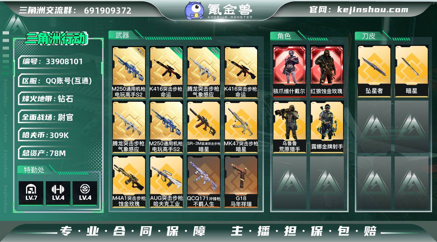 【sjz7535】总资产:78.8M, 哈夫币:309528 ;总资产78M/哈夫币30万/战场等级50/行动等级60/安全箱等时效性道具以游戏内数据为准,详情请看图 红狼-蚀金玫瑰,骇爪-维什戴尔,露娜-金牌射手,乌鲁鲁-荒原猎手,近战-暗星,近战-坠星者,近战-处刑者4级,近战-黑鹰,K416突击步枪-命运,腾龙突击步枪-气象感应,M250通用机枪-电玩高手S2,M4A1突击步枪-蚀金玫瑰,M4A1突击步枪-阿米娅,AKM突击步枪-锦绣,K416突击步枪-行动记录,AUG突击步枪-哈夫克工业,SG552突击步枪-运动员,SCAR-H战斗步枪-启航,腾龙突击步枪-马年祥瑞,腾龙突击步枪-万金泪冠,K437突击步枪-锦绣,KC17突击步枪-电锯惊魂,MK47突击步枪-暗星,Vector冲锋枪-夜莺,SMG-45冲锋枪-锦绣,SR-3M紧凑突击步枪-暗星,勇士冲锋枪-万金泪冠,QCQ171冲锋枪-不羁人生,MK4冲锋枪-夜莺,Mini-14射手步枪-夜莺,M14射手步枪-蛮荒,R93狙击步枪-维什戴尔,AWM狙击步枪-万金泪冠,G18-马年祥瑞,QBZ95-1突击步枪-曙光,K416突击步枪-冬日风情,K416突击步枪-腊梅,K416突击步枪-阿萨拉特攻,AUG突击步枪-蝮蛇,M7战斗步枪-百步穿杨,SG552突击步枪-深海恐惧,SG552突击步枪-哈夫克警备,SCAR-H战斗步枪-囚徒,G3战斗步...
