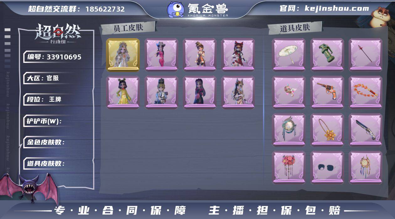 【账号已绑定信息】:邮箱 【耀世皮肤】:薇薇安-圣光之谕 【典藏皮肤】:小黄-呱呱雨衣,爱丽丝-耀眼的你,爱丽丝-丝缕哀歌,阿念-庆宴绮愿,阿念-王子与骑士,薇薇安-白光莹,莉莉-莓果陷阱 【道具皮肤】:传送按钮-昆仑镜,伞-郁金春信,额外的背包-飞花令,长枪-罪棘,长鞭-新春炸响,摸金符-花落精绝,短管猎枪-星光的裁决,夜视仪-金丝眼镜,音响-鸣沙鼓,喷气背包-乘风溯雪,转轮手枪-新星时代,电击枪-甜蜜泡泡枪,急救包-蔷薇物语,闪光弹-金戈玄铜