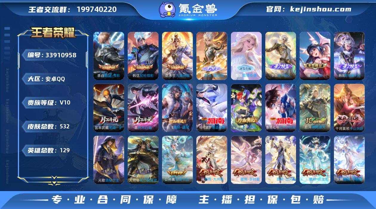 安卓Q-V10-永恒钻石II段位-129英雄-532皮肤-3典藏皮肤-5无双-6珍品传说-77传说-173史诗 【英雄全皮】:廉颇全皮,刘禅全皮,元歌全皮,刘邦全皮,孙权全皮,艾琳全皮,橘右京全皮,苍全皮,鬼谷子全皮,百里守约全皮,盾山全皮,猪八戒全皮,大司命全皮,敖隐全皮,西施全皮,蒙恬全皮,澜全皮,镜全皮,阿古朵全皮,夏洛特全皮,司空震全皮,金蝉全皮,赵怀真全皮,莱西奥全皮,戈娅全皮,空空儿全皮,影全皮,姬小满全皮 【荣耀典藏】:李白鸣剑曳影,花木兰九霄神辉,韩信弑枪猎影 【无双皮肤】:曜器灵螭龙剑,甄姬雪境奇遇,韩信群星魔术团,李白碎月剑心,瑶真我赫兹 【珍品传说】:宫本武藏黑崎一护,暃朽木白哉,张飞兔狲蓬尾,孙策时之奇旅,鲁班七号江户川柯南,马可波罗怪盗基德 【传说皮肤】:后羿神树通天,干将莫邪千山共赴,元歌诡秘之主,大司命死亡执政官,公孙离云诺千山,西施续相思,司空震愿照山河定,女娲愿照千秋盛,妲己愿照众生和,澜愿照九州拓,蔡文姬愿照福禄聚,虞姬愿照岁时盈,云缨幻光神枪,裴擒虎祥瑞亨通,嬴政玄雷天君,王昭君映山客,桑启鸣野蒿,铠冥王哈迪斯,亚连落雪白狼,典韦战鼓燎原,孙尚香乘龙问璇玑,澜逐花归海,艾琳觅芳踪,...
