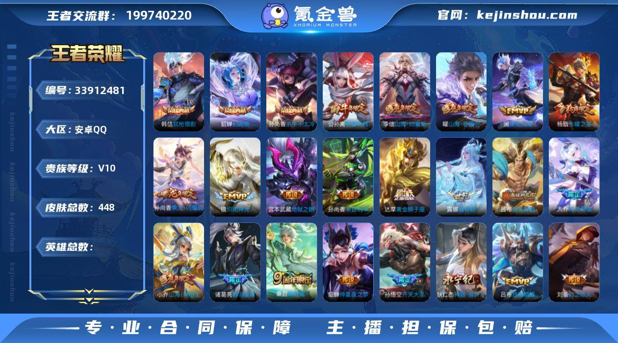 V10 3典藏 1无双 53传说 448皮肤 【3水晶】孙尚香-杀手不太冷,貂蝉-幻阙歌,韩信-弑枪猎影【1无双】【53传说】项羽-无限倾心,虞姬-无限倾心,曜-山海·苍雷引,小乔-山海·琳琅生,孙悟空-齐天大圣,李信-山海·炽霜斩,狄仁杰-神器·狴犴令,达摩-黄金狮子座,貂蝉-仲夏夜之梦,公孙离-祈雪灵祝,宫本武藏-地狱之眼,镜-炽阳神光,铠-绛天战甲,刘备-时之恋人,梦奇-胖达荣荣,孙尚香-末日机甲,杨戬-永曜之星,张良-黄金白羊座,吕布-怒海麟威,宫本武藏-惊梅引,诸葛亮-鹤羽星尊,东皇太一-灼幽烈阳,伽罗-炽翼辉光,干将莫邪-画中仙,花木兰-燃星之曲,孙尚香-乘龙·问璇玑,兰陵王-影龙天霄,大乔-时之奇旅,吕布-遇见神鼓,张飞-百相守梦,甄姬-至美·化雀舞,露娜-霜月吟,艾琳-觅芳踪,澜-逐花归海,桑启-鸣野蒿【25史诗】庄周-天秀·幻梦,不知火舞-魅语,妲己-热情桑巴,狄仁杰-魔术师,貂蝉-逐梦之音,公孙离-无限星赏官,花木兰-青春决赛季,花木兰-瑞麟志,李元芳-银河之约,廉颇-寅虎·御盾,吕布-末日机甲,蒙犽-龙鼓争鸣,裴擒虎-李小龙,司马懿-暗渊魔法,杨玉环-遇见飞天,嬴政-暗夜贵公子,赵云-皇家上将,周瑜-真爱至上,夏侯惇-匿光决锋者,曹操-夜都魔契,白起-苍鳞隐世,赵怀真-器灵·浮梦炉,狄仁杰-绮世丹青,亚瑟-布丁...