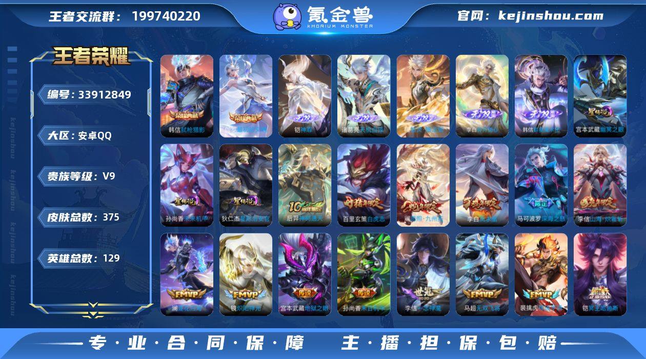 V9 2典藏 6无双 33传说 3星元 375皮肤 129英雄 【2水晶】韩信-弑枪猎影,伽罗-最初的交响【6无双】李白-碎月剑心,韩信-群星魔术团,曜-器灵·螭龙剑,诸葛亮-天机白泽,铠-神罪【33传说】孙悟空-齐天大圣,李信-山海·炽霜斩,马可波罗-深海之息,马超-无双飞将,百里玄策-白虎志,狄仁杰-超时空战士,干将莫邪-久胜战神,宫本武藏-地狱之眼,后羿-黄金射手座,镜-炽阳神光,铠-绛天战甲,李白-凤求凰,李信-一念神魔,梦奇-胖达荣荣,孙尚香-末日机甲,孙悟空-地狱火,孙悟空-零号·赤焰,王昭君-乞巧织情,小乔-音你心动,虞姬-启明星使,赵云-淬星耀世,诸葛亮-鹤羽星尊,马可波罗-妄想实况,东皇太一-灼幽烈阳,澜-逐花归海,铠-琥珀纪元,铠-冥王哈迪斯,桑启-鸣野蒿,裴擒虎-祥瑞亨通,澜-愿照·九州拓,后羿-神树通天【3星元】狄仁杰-星际治安官,孙尚香-未来机甲,宫本武藏-幽冥之眼【83史诗】元歌-无心,鬼谷子-五谷丰年,赵云-未来纪元,钟无艳-超时空战士,澜-赏金猎手,阿轲-节奏热浪,安琪拉-心灵骇客,白起-星夜王子,百里守约-特工魅影,百里玄策-原初追逐者,百里玄策-热力回旋,不知火舞-魅语,蔡文姬-舞动绿茵,曹操-幽灵船长,曹操-天狼征服者,程咬金-功夫厨神,妲己-魅力维加斯,妲己-时之彼端,大乔-猫狗日记,大乔-...