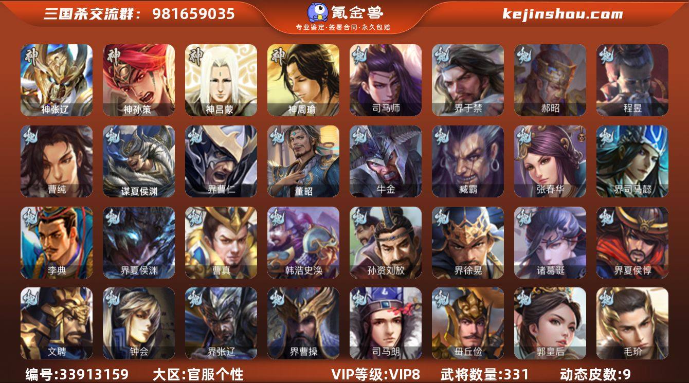 【JYSGS416】官阶:骠骑将军 VIP等级:VIP8级 史诗武将数:21 动态皮肤数:9 武将总数:331 史诗宝珠数:0 元宝数:0 将魂数:258 /神张辽/神孙策/郝昭/界于禁/程昱/曹纯/司马师/花鬘/界黄忠/沙摩柯/界朱然/贺齐/左慈/许攸/陶谦/司马徽/审配/公孙康/兀突骨/庞德公/星黄忠/蒯越蒯良/王基/毌丘俭/谋徐晃/谋夏侯渊/卞夫人/袁涣/界曹操/界司马懿/界夏侯惇/界张辽/界许褚/界郭嘉/界甄姬/界夏侯渊/界曹仁/界典韦/界荀彧/界徐晃/界曹丕/界邓艾/张春华/钟会/曹冲/郭淮/满宠/曹真/韩浩史涣/陈群/曹叡/曹休/钟繇/界曹植/界王异/界郭淮/界陈群/郭皇后/孙资刘放/辛宪英/诸葛诞/曹昂/SP关羽/SP姜维/文聘/乐进/司马朗/SP蔡文姬/SP曹仁/李通/李典/吕虔/杜畿/鲁芝/张恭/毛玠/朱灵/董昭/臧霸/牛金/华雄/袁术/蔡文姬/卢植/仲帝袁术/谋刘赪/谋华雄/荀谌/孔融/高览/界华佗/界吕布/界华雄/界袁术/界貂蝉/界张角/界于吉/界庞德/界颜良文丑/界袁绍/公孙瓒/伏皇后/李儒/蔡夫人/公孙渊/郭图逢纪/界高顺/界公孙瓒/界刘表/刘虞/曹节/蔡邕/伏完/张宝/SP貂蝉/SP赵云/刘协/SP黄月英/严白虎/蹋顿/张鲁/刘琦/董白/樊稠/SP太史慈/刘繇/李傕/张济/丁原/王濬/张任/星张郃/星徐晃/神吕蒙/神周瑜/严颜/陈到/谋张飞/陈震/界刘...