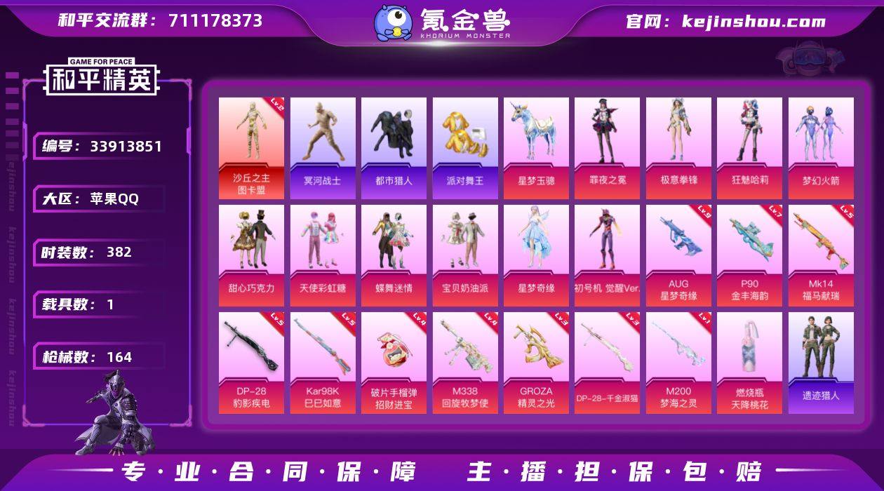 精氪素材号/地铁号【2级图卡盟/木乃伊/都市/金鞋/小番茄/暗夜之虎】9级星梦奇缘/三级狗杂精灵之光/巧克力三姐妹/觉醒螳螂/罪恶之冕/满级p90/冰马/地铁满天赋 实名: 可修改 时装数: 382 载具数: 1 枪械数: 164 战备数: 119 神级装扮: 沙丘之主-图卡盟 热门装扮: 梦幻火箭(新101),蝶舞迷情,甜心巧克力,宝贝奶油派,天使彩虹糖,鹰眼刺客,都市猎人,冥河战士,派对舞王,星梦奇缘,初号机 觉醒Ver.,狂魅哈莉,极意拳锋,罪夜之冕 载具: 星梦玉骢 稀有枪皮: M200梦海之灵,AUG星梦奇缘,P90-金丰海韵,GROZA-精灵之光,DP-28-千金淑猫,Kar98K-巳巳如意,DP-28-豹影疾电,燃烧瓶-天降桃花,破片手榴弹-招财进宝