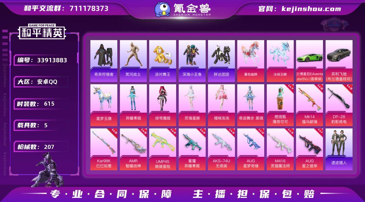 木乃伊,三级Aug星梦奇缘,苏尔南手枪打造50%,灵猫法师M416,无垠阁Aks74U,胖达团团,粉熊背包,深海小丑鱼,小金鞋,三个马皮,两个车皮