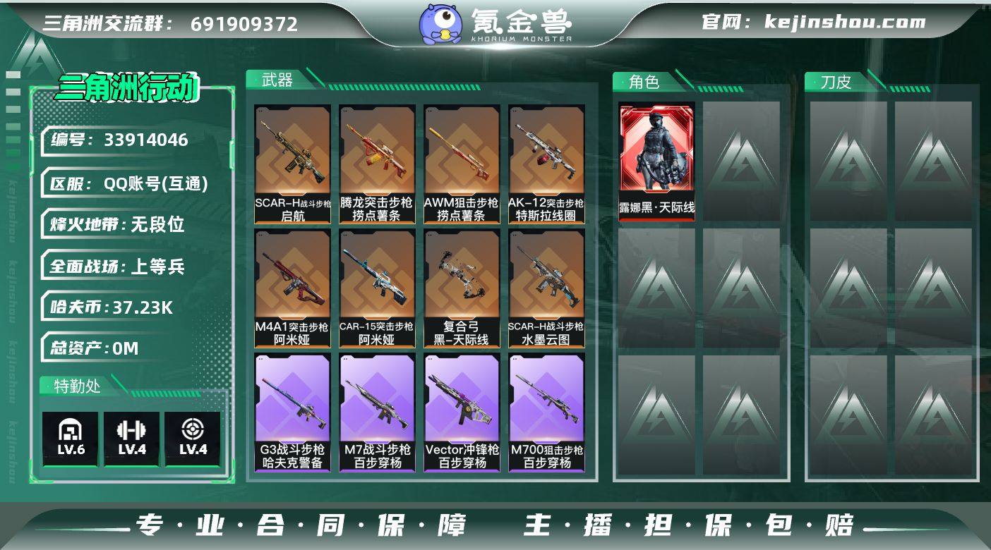 【SJZD4096】总资产98M/哈夫币3723万/传说近战数1/传说枪皮数27/战场等级48/行动等级49/安全箱等时效性道具以游戏内数据为准,详情请看图/露娜-黑·天际线/深蓝-不破誓约/红狼-电锯惊魂/露娜-金牌射手/近战-暗星/黑鹰/M4A1突击步枪-阿米娅/AKM突击步枪-锦绣/K416突击步枪-行动记录/SG552突击步枪-运动员/AK-12突击步枪-特斯拉线圈/SCAR-H战斗步枪-水墨云图/SCAR-H战斗步枪-启航/CAR-15突击步枪-阿米娅/腾龙突击步枪-捞点薯条/腾龙突击步枪-马年祥瑞/K437突击步枪-锦绣/KC17突击步枪-电锯惊魂/47突击步枪-暗星/Vector冲锋枪-能天使-午夜邮差/UZI冲锋枪-特斯拉线圈/SMG-45冲锋枪-锦绣/SR-3M紧凑突击步枪-特斯拉线圈/SR-3M紧凑突击步枪-暗星/勇士冲锋枪-能天使-午夜邮差/M250通用机枪-骑士之心/M14射手步枪-缄花/SR-25射手步枪-缄花/AWM狙击步枪-捞点薯条/.357左轮-缄花/G18-马年祥瑞/93R-捞点薯条/复合弓-黑-天际线/ASh-12战斗步枪-无极限/K416突击步枪-冬日风情/AUG突击步枪-蝮蛇/M7战斗步枪-百步穿杨/SCAR-H战斗步枪-囚徒/G3战斗步枪-流沙送葬/G3战斗步枪-哈夫克警备/AS Val突击步枪-典狱官/AS Val突击步枪-百步穿杨/腾龙突击步枪-猎鳄行动/K437突击步枪-守护者/MP5冲锋枪深海...
