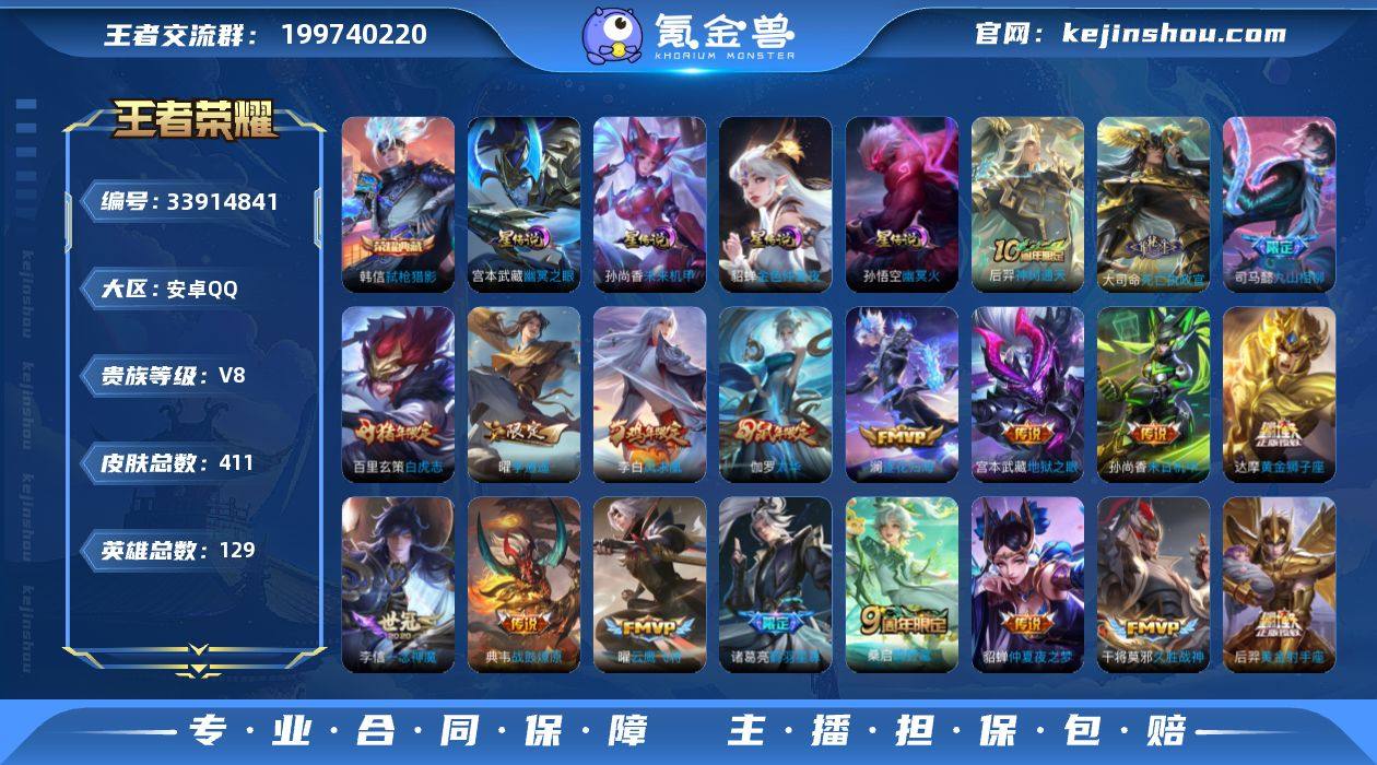 V8 1典藏 1珍品 35传说 4星元 411皮肤 129英雄 【1水晶】韩信-弑枪猎影【1珍品传说】【35传说】后羿-无尽星芒,百里玄策-白虎志,达摩-黄金狮子座,貂蝉-仲夏夜之梦,貂蝉-猫影幻舞,伽罗-太华,干将莫邪-久胜战神,宫本武藏-地狱之眼,后羿-黄金射手座,铠-绛天战甲,李白-凤求凰,李信-一念神魔,刘备-时之恋人,梦奇-胖达荣荣,孙尚香-末日机甲,孙悟空-地狱火,孙悟空-零号·赤焰,曜-李逍遥,虞姬-云霓雀翎,虞姬-启明星使,诸葛亮-鹤羽星尊,典韦-战鼓燎原,澜-逐花归海,曜-云鹰飞将,桑启-鸣野蒿,大司命-死亡执政官,司马懿-九山相柳,后羿-神树通天【4星元】孙尚香-未来机甲,孙悟空-幽冥火,宫本武藏-幽冥之眼,貂蝉-金色仲夏夜之梦【105史诗】元歌-无心,鬼谷子-五谷丰年,弈星-滕王阁序,赵云-未来纪元,钟无艳-超时空战士,高渐离-天秀·音浪,澜-赏金猎手,夏洛特-永昼,阿轲-暗夜猫娘,阿轲-节奏热浪,阿轲-迷踪丽影,安琪拉-心灵骇客,白起-星夜王子,百里守约-特工魅影,百里玄策-原初追逐者,蔡文姬-舞动绿茵,曹操-幽灵船长,曹操-天狼征服者,蔡文姬-繁星吟游,嫦娥-拒霜思,程咬金-功夫厨神,妲己-女仆咖啡,妲己-魅力维加斯,大乔-猫狗日记,狄仁杰-魔术师,狄仁杰-鹰眼统帅,貂蝉-圣诞恋歌,伽罗-箭羽风息,宫本武...