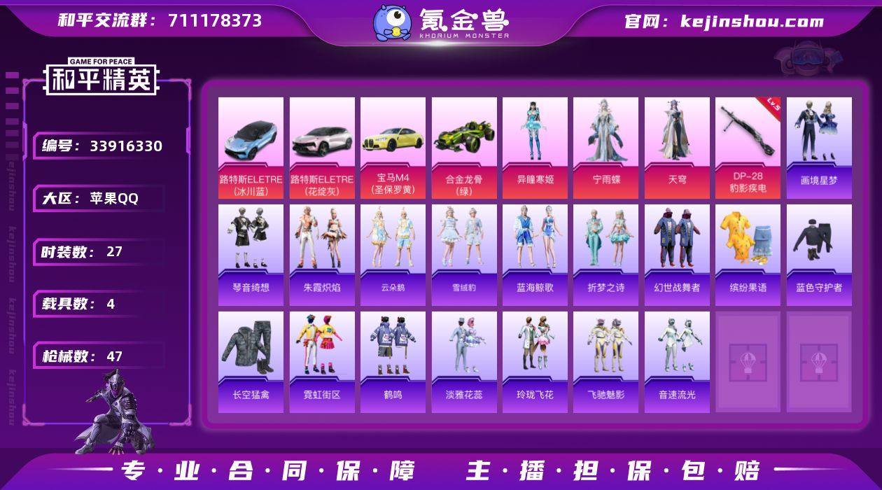 【LHPX2801】【特价出售/店主推荐】苹果手Q-3粉装-1特效枪-4载具-3粉色飞行器-19478热力值-27套装-47枪皮 【粉色套装】:角色-宁雨蝶,角色-天穹,角色-异瞳寒姬 【粉色枪皮等级】:DP-28-豹影疾电(五级) 【粉色载具】:路特斯ELETRE(冰川蓝),路特斯ELETRE(花绽灰),宝马M4(圣保罗黄),合金龙骨(绿) 【粉色枪皮】:DP-28-豹影疾电 【粉色飞行器】:宁雨蝶飞行器,桃源时光飞行器,极意拳锋飞行器 【粉色降落伞】:洛神天依降落伞,碧影闪光降落伞,宁雨蝶降落伞,荧海星豚降落伞,绯穹魔姬降落伞,极意拳锋降落伞 【稀有套装】:套装-云朵鹅,套装-雪绒豹,套装-蓝海鲸歌,套装-折梦之诗,套装-朱霞炽焰,套装-画境星梦,套装-琴音绮想 【稀有枪皮】:SCAR-L-碧影闪光,M416-红色方程式,AUG-耀粉歌者,QBZ-飞驰魅影,M762-云朵鹅,蜜獾-绯穹魔姬,ACE32-画境星梦,ARX-凌霄紫焰,UZI-天降萌叽,UMP45-蓝色火焰,Vector-彩虹符号,汤姆逊-耀粉歌者,汤姆逊-灵猫魔法师,MP5K-画境星梦,JS9-凌霄紫焰,P90-飞驰魅影,Kar98K-飞驰魅影,Mini14-耀粉歌者,SVD-云朵鹅,M1加兰德-画境星梦,S686-生命誓言,S1897-碧影闪光,S1897-飞驰魅影,S12K-极意拳锋,DBS-圣堂之誓...
