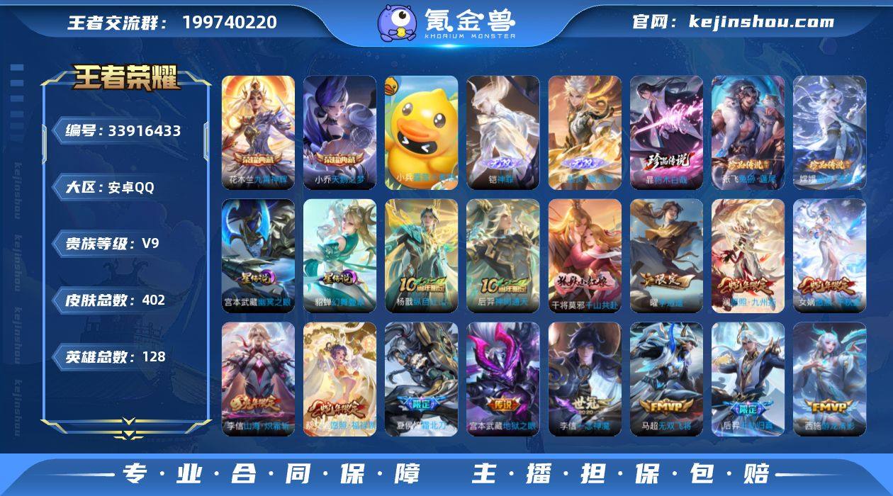 【WZAHC2966】贵族等级9/荣耀典藏数量2/传说皮肤数量33/史诗皮肤数量126/皮肤数量402/英雄数量128/段位尊贵铂金/刘禅全皮/姜子牙全皮/孙权全皮/莱西奥全皮/戈娅全皮/空空儿全皮/天鹅之梦/九霄神辉/神罪/器灵·螭龙剑/幽冥之眼/幻舞叠翠/朽木白哉/兔狲·蓬尾/器灵·落星盏/纵目迁山/神树通天/千山共赴/星之鸣奏/千劫归真/愿照·千秋盛/愿照·九州拓/愿照·福禄聚/鸣野蒿/牧神诗旅/夏侯惇霜北刀/小动物乐团/至美·化雀舞/惊梅引/灼幽烈阳/记忆之芯/画中仙/山海·炽霜斩/无双飞将/乞巧织情/游龙清影/李逍遥/音你心动-周瑜/启明星使/一念神魔/猫影幻舞/黄金白羊座/久胜战神/云霓雀翎/黄金射手座/仲夏夜之梦/地狱之眼/超时空战士-狄仁杰/露营小黄鸭/虞姬夏日便利店/天穹之誓(s36)/阴阳师/寅虎·御盾/皇家上将/引擎之心/神迹守卫-墨子/降魔/时之奇旅-妲己/优雅恋人/狮舞东方/乒乒小将/云端筑梦师/高山流水/死亡摇滚/玩趣恶龙/超时空战士-钟无艳/天狼运算者/奇幻香踪/夜都怪侠/幻夜卜梦/云间偶戏/无心/游园惊梦/落雪兰心/暗影游猎/魔术师/万华元夜(s22)/星际陆战队-达摩/沙漠行僧(s26)/海滩派对/醍醐杖(s20)/航海奇遇记/演武夺筹(s23)/午后时光/金庭之子(s27)/潮玩骑士王/大圣娶亲/圣弓游侠/云...