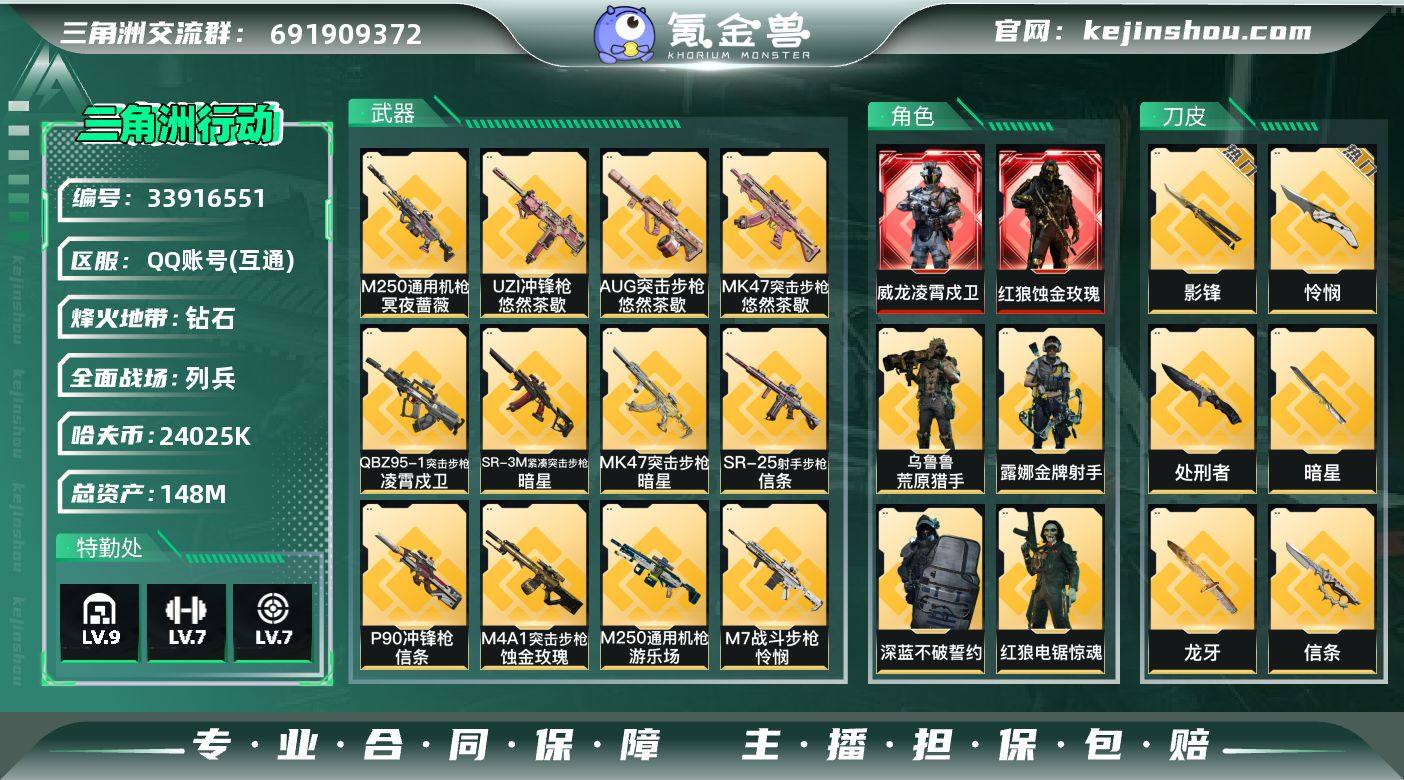 【SJZ5105】总资产148M/哈夫币2402万/传说近战数1/传说枪皮数38/战场等级50/行动等级60/安全箱等时效性道具以游戏内数据为准,详情请看图/红狼-蚀金玫瑰/威龙-凌霄戍卫/蜂医-送葬人·无题密令(S5)/无名-夜鹰(S4)/深蓝-不破誓约(S6)/红狼-电锯惊魂/露娜-金牌射手(S7)/乌鲁鲁-荒原猎手/牧羊人-黑鹰坠落/近战-暗星/近战-信条/近战-影锋/近战-怜悯/近战-赤枭/近战-龙牙/近战-处刑者/近战-黑鹰/M4A1突击步枪-蚀金玫瑰/M4A1突击步枪-阿米娅/QBZ95-1突击步枪-凌霄戍卫/ASh-12战斗步枪-怜悯/AUG突击步枪-悠然茶歇/AUG突击步枪-西装暴徒/M7战斗步枪-零度协议/M7战斗步枪-怜悯/SG552突击步枪-运动员/AK-12突击步枪-夜鹰/AK-12突击步枪-特斯拉线圈/SCAR-H战斗步枪-启航/CAR-15突击步枪-阿米娅/AS Val突击步枪-蛇年祥瑞/腾龙突击步枪-捞点薯条/KC17突击步枪-电锯惊魂/MK47突击步枪-悠然茶歇/MK47突击步枪-暗星/P90冲锋枪-信条/UZI冲锋枪-特斯拉线圈/UZI冲锋枪-悠然茶歇/SMG45冲锋枪-骑士/SR-3M紧凑突击步枪-特斯拉线圈/SR-3M紧凑突击步枪-暗星/勇士冲锋枪-能天使-午夜邮差/725双管霰弹枪-送葬人-无题密令/M250通用机枪-游乐场/M250通用机枪-骑士之心/M250通用机枪-冥夜蔷薇/M14射手步枪-蛮...